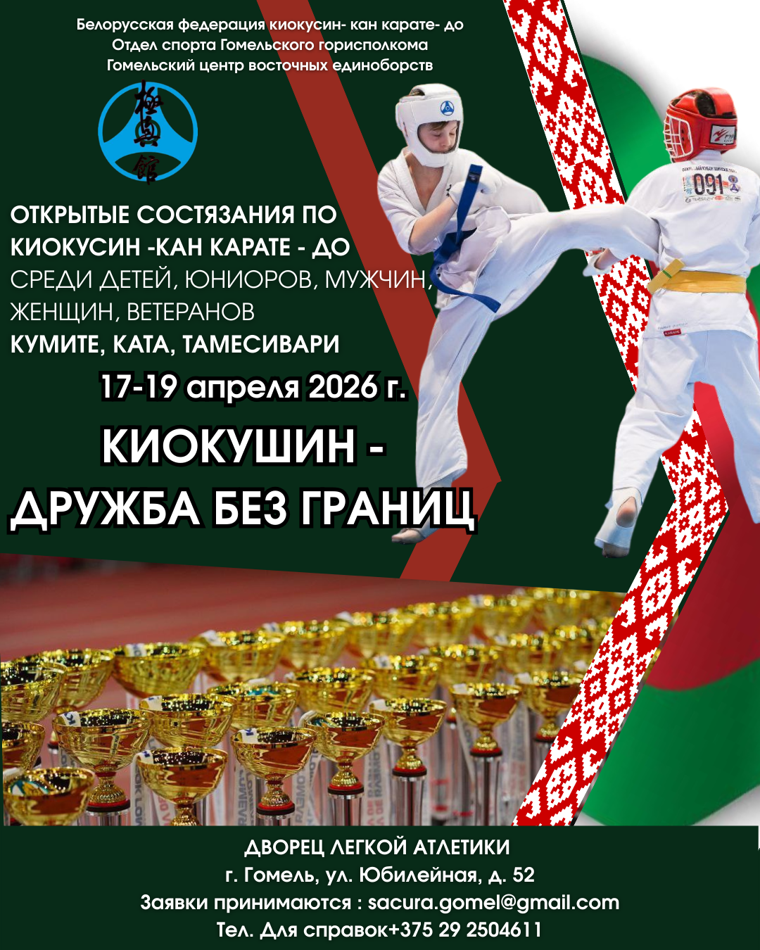 Нас приглашают! Открытый турнир по Кёкусин-кан (кумитэ, ката, тамэсивари) среди детей 8-9 лет, мужчин и женщин, ветеранов (мужчины) «Киокушин – Дружба без границ!!!». Беларусь, г. Гомель, 17 – 19 апреля 2026 г.