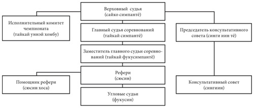 2. Поединки обслуживает судейская бригада, состоящая из 1 рефери (сюсин), 4 угловых судей (фукусин) и 2 судей-помощников рефери (сюсин хоса). При этом организаторы соревнований имеют право отказаться от назначения помощников рефери.