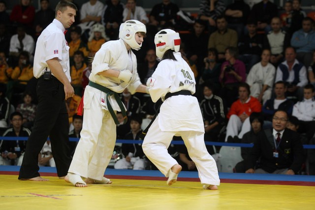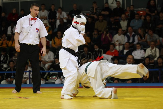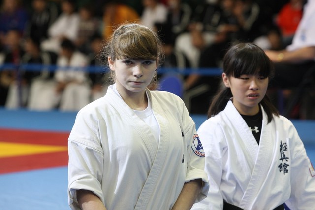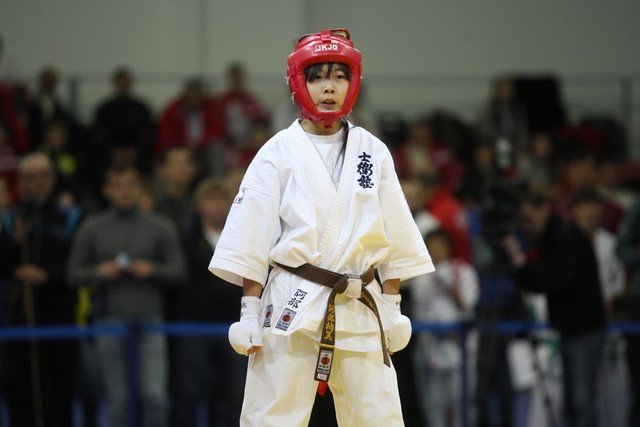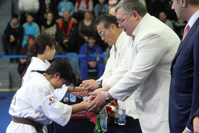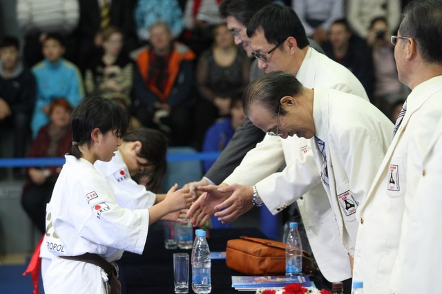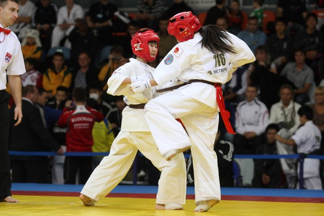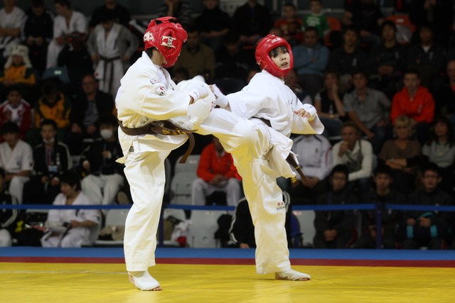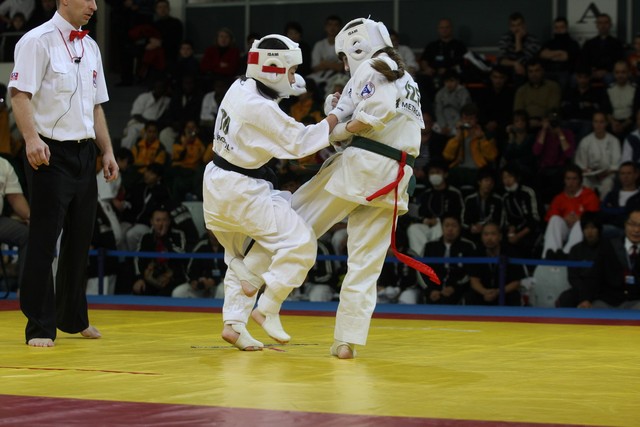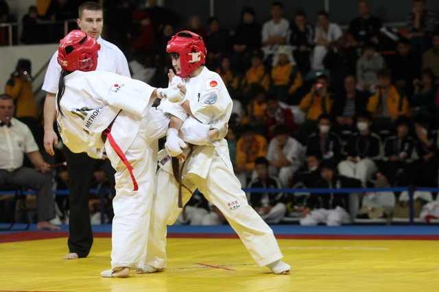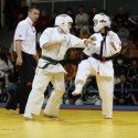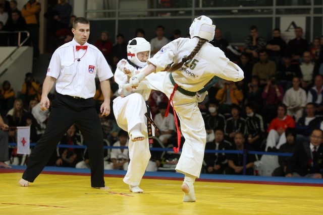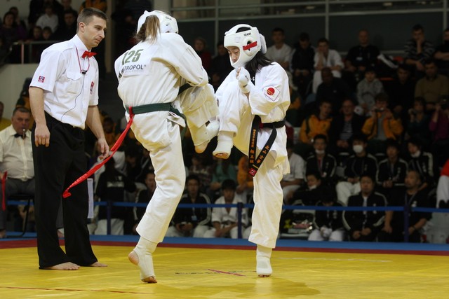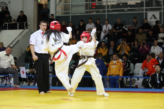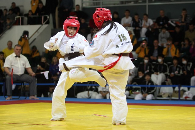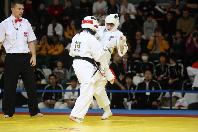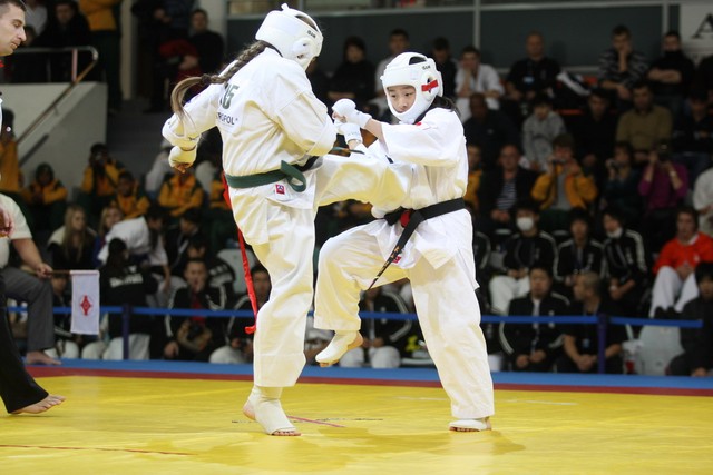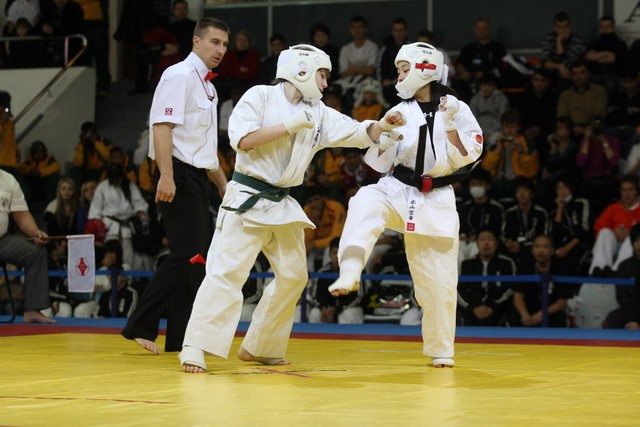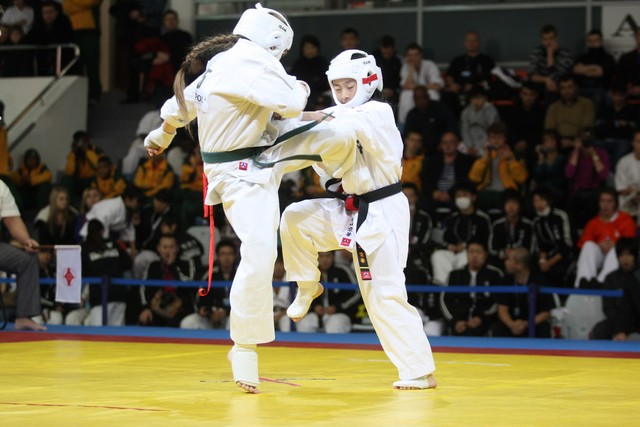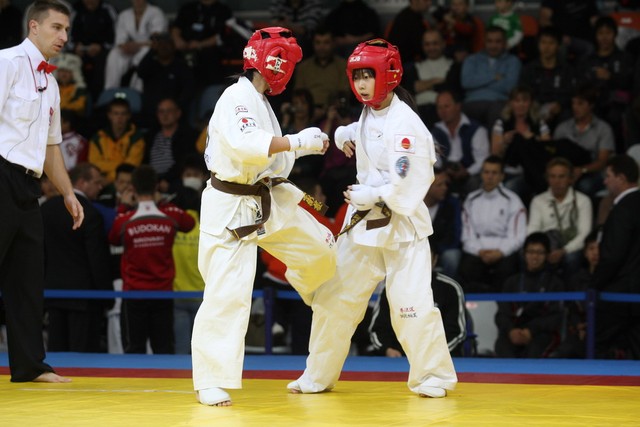 Финальные поединки в категориях «Девушки 12-13 лет, до 40 кг» (Абэ Юдзуми, Япония – Асами Нагоми, Япония) и «Девушки 12-13 лет, до 45 кг» (Есина Алёна, Россия, Кёкусин-кан, Астрахань – Нагаяма Кёка, Япония). Фото О. Бессуднова