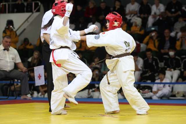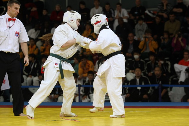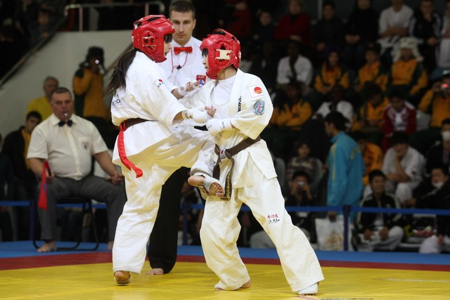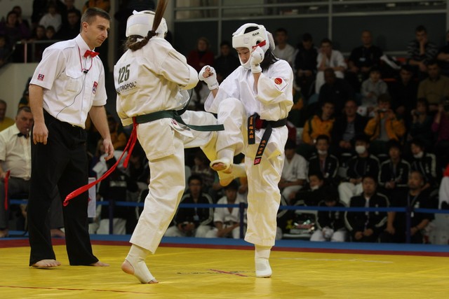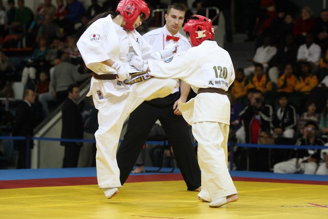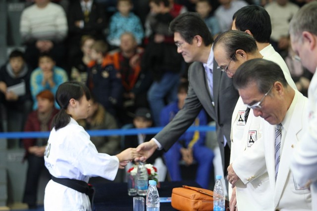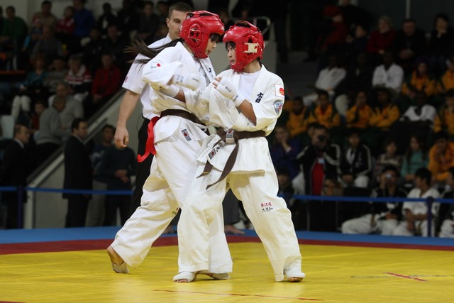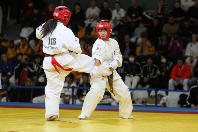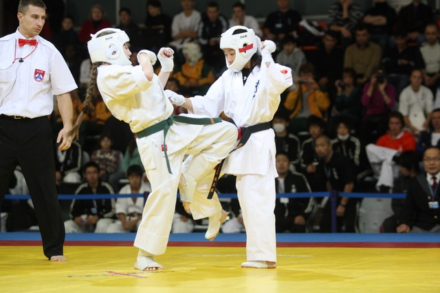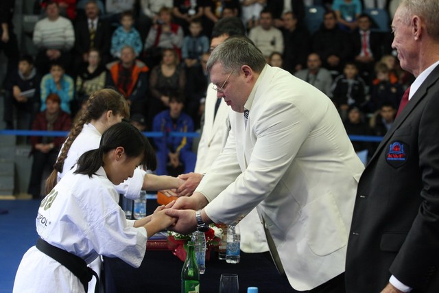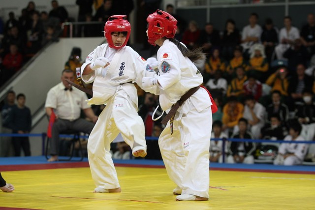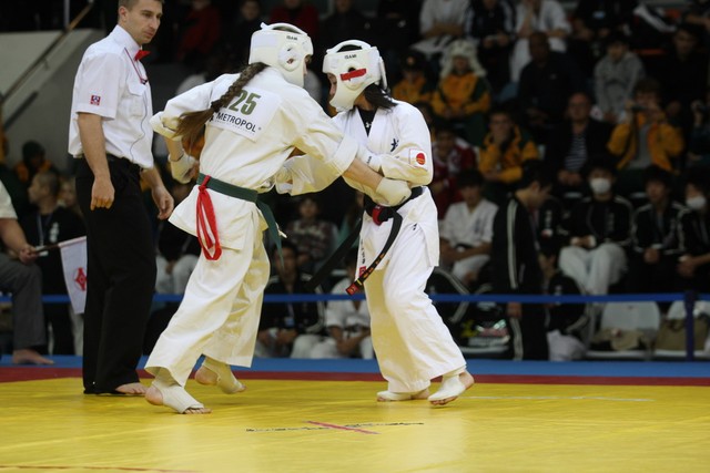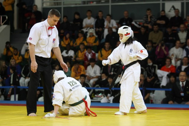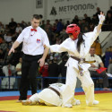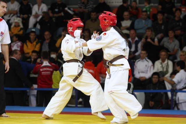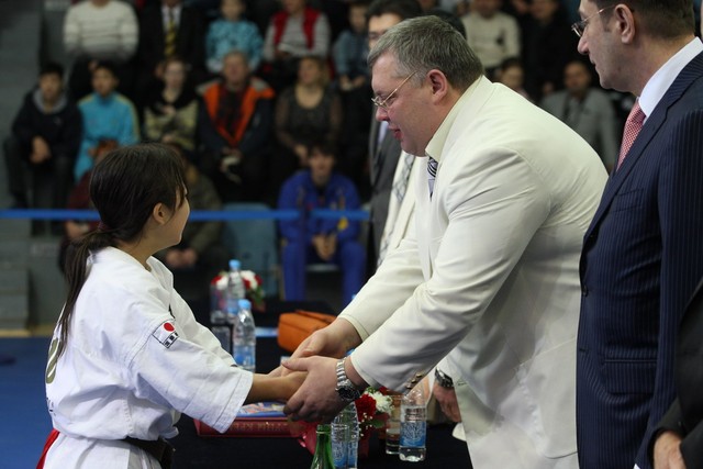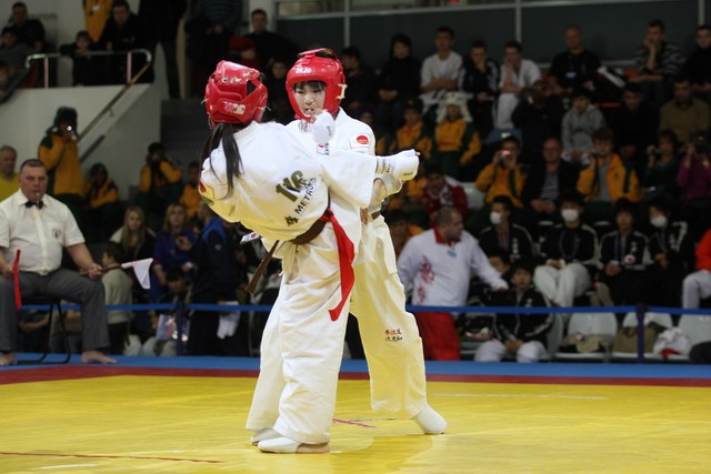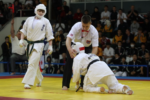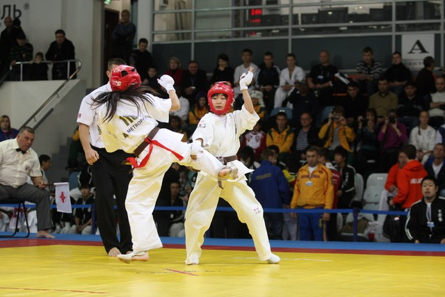 Финальные поединки в категориях «Девушки 12-13 лет, до 40 кг» (Абэ Юдзуми, Япония – Асами Нагоми, Япония) и «Девушки 12-13 лет, до 45 кг» (Есина Алёна, Россия, Кёкусин-кан, Астрахань – Нагаяма Кёка, Япония). Фото О. Бессуднова