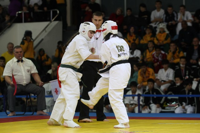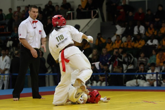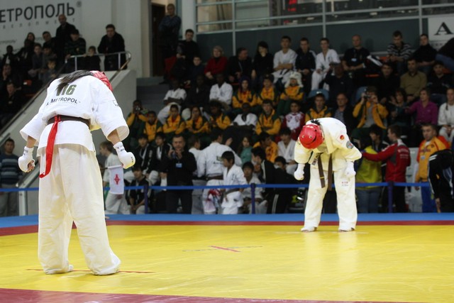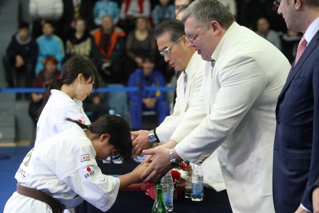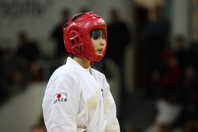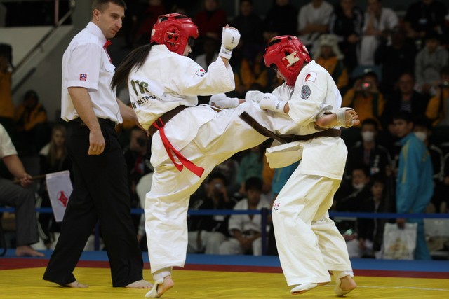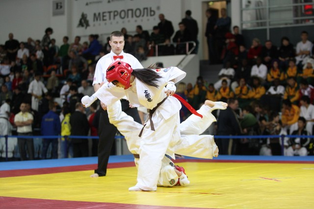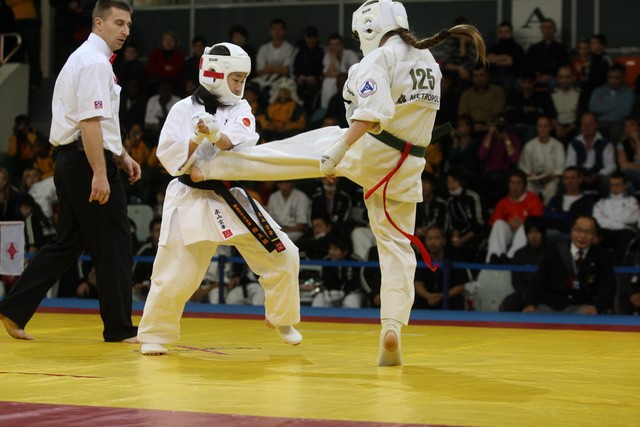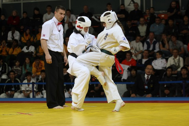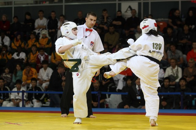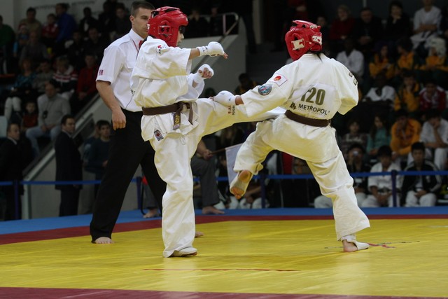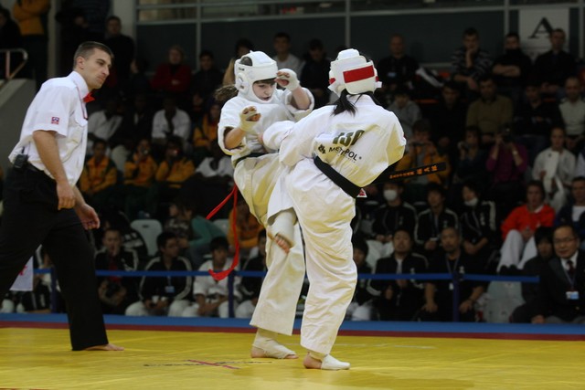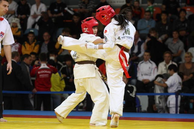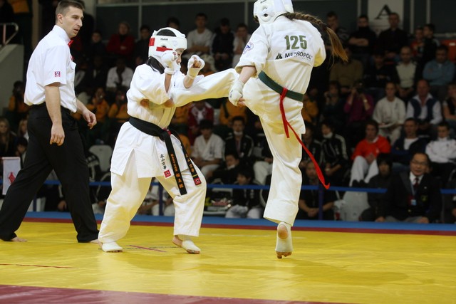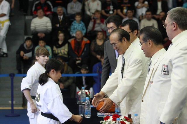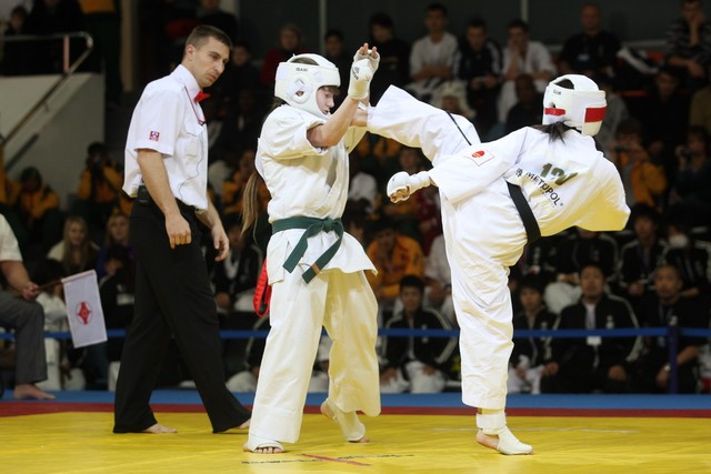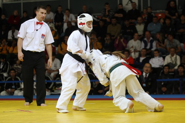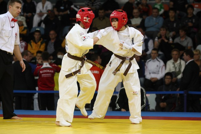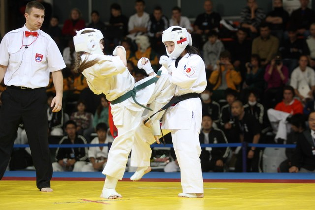 Финальные поединки в категориях «Девушки 12-13 лет, до 40 кг» (Абэ Юдзуми, Япония – Асами Нагоми, Япония) и «Девушки 12-13 лет, до 45 кг» (Есина Алёна, Россия, Кёкусин-кан, Астрахань – Нагаяма Кёка, Япония). Фото О. Бессуднова