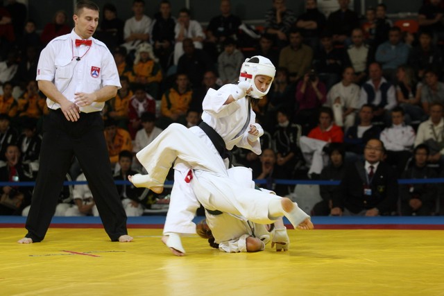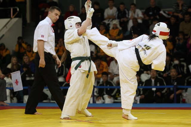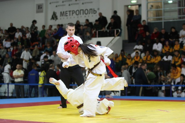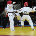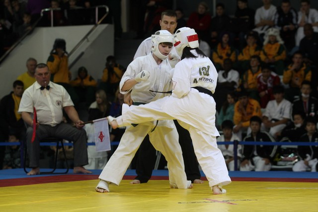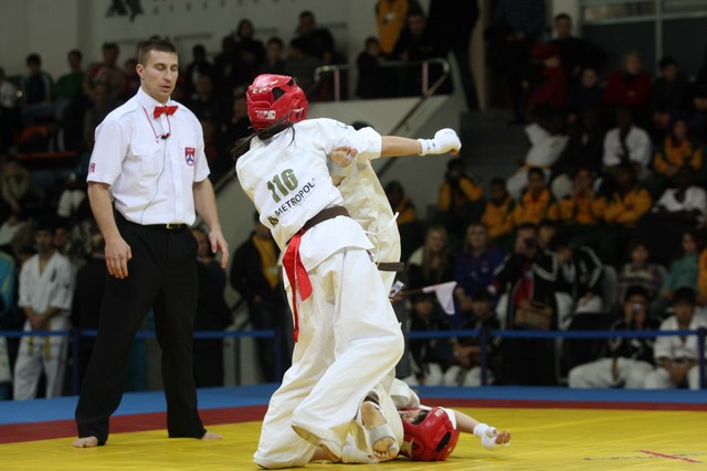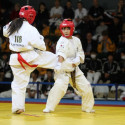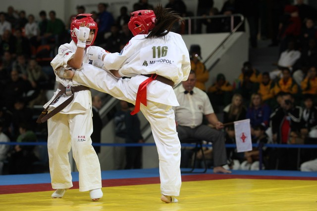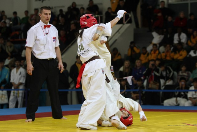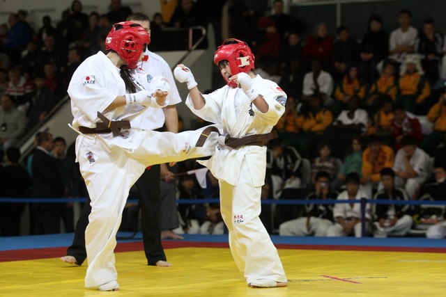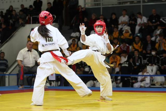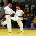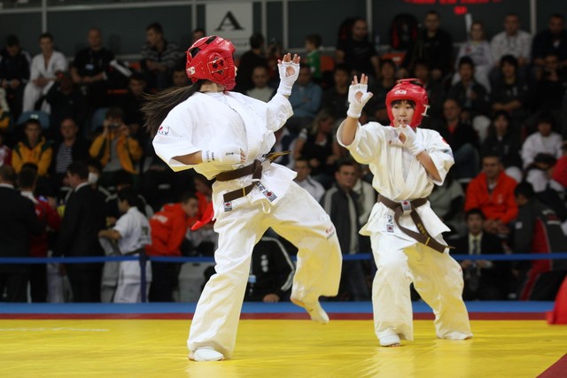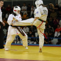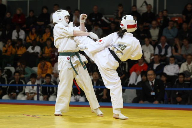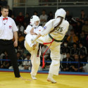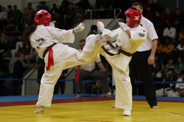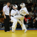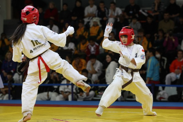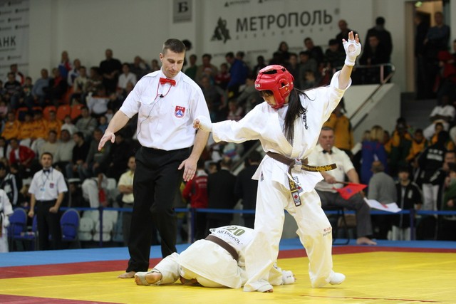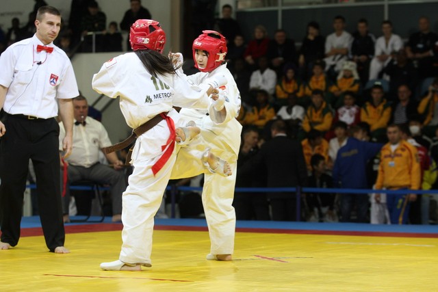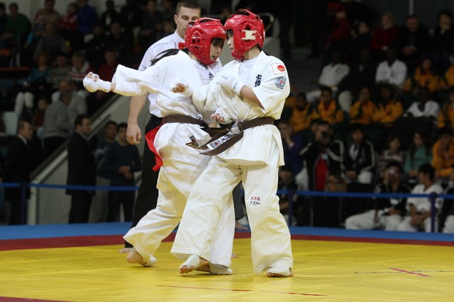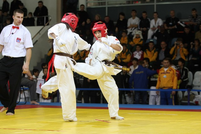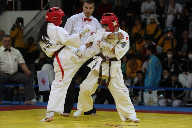 Финальные поединки в категориях «Девушки 12-13 лет, до 40 кг» (Абэ Юдзуми, Япония – Асами Нагоми, Япония) и «Девушки 12-13 лет, до 45 кг» (Есина Алёна, Россия, Кёкусин-кан, Астрахань – Нагаяма Кёка, Япония). Фото О. Бессуднова