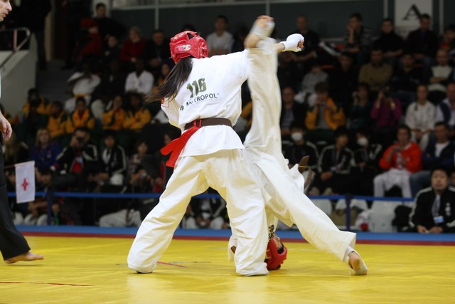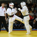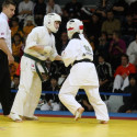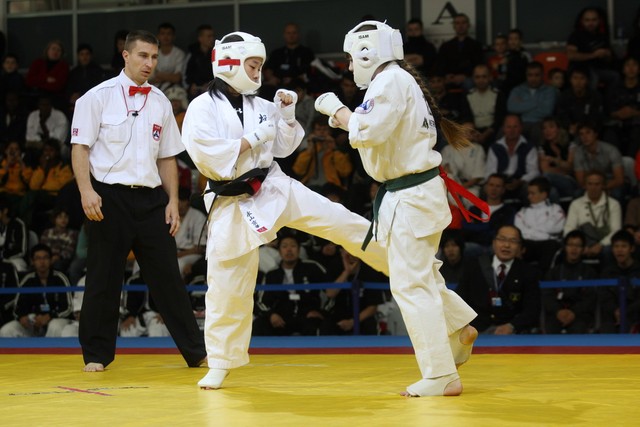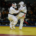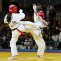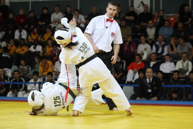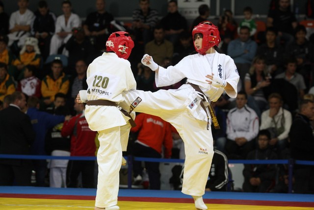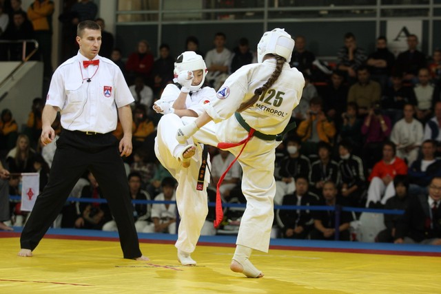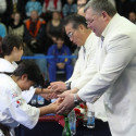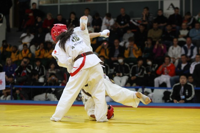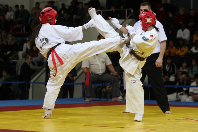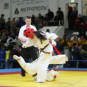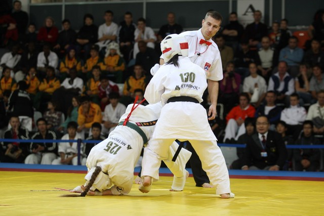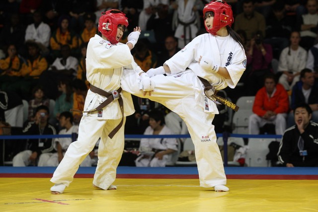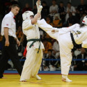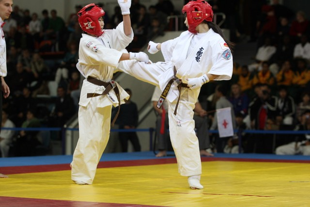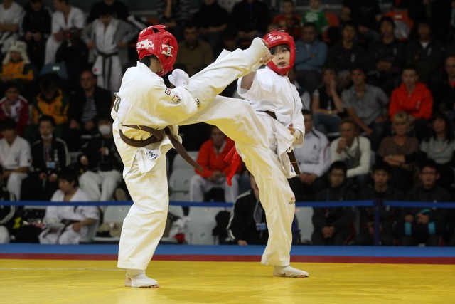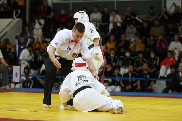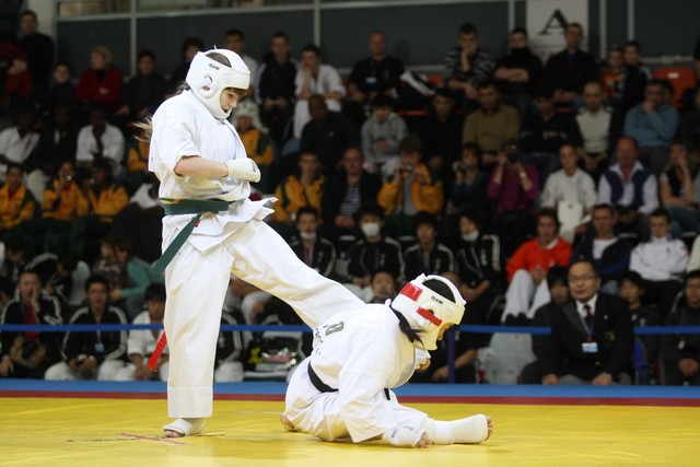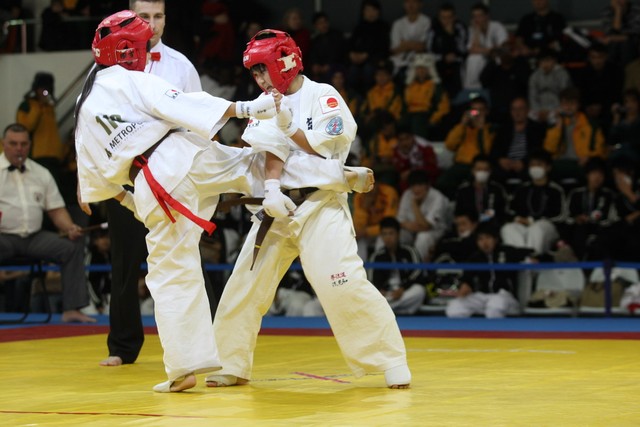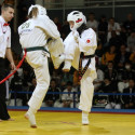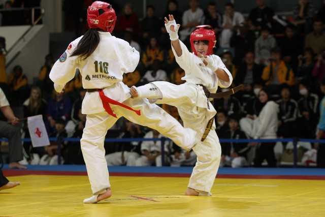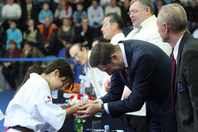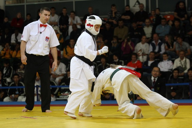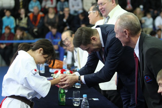 Финальные поединки в категориях «Девушки 12-13 лет, до 40 кг» (Абэ Юдзуми, Япония – Асами Нагоми, Япония) и «Девушки 12-13 лет, до 45 кг» (Есина Алёна, Россия, Кёкусин-кан, Астрахань – Нагаяма Кёка, Япония). Фото О. Бессуднова