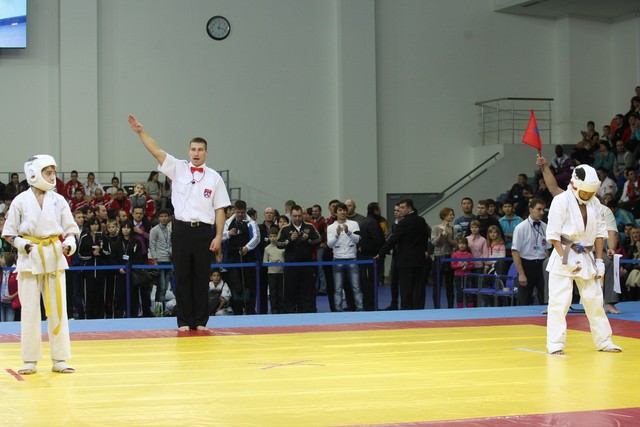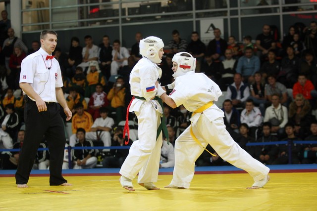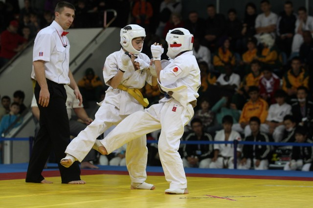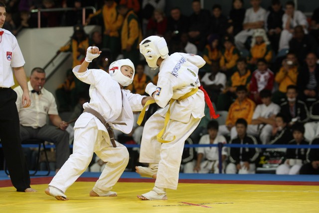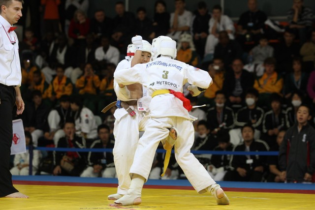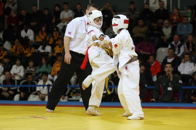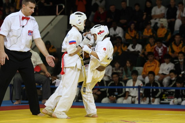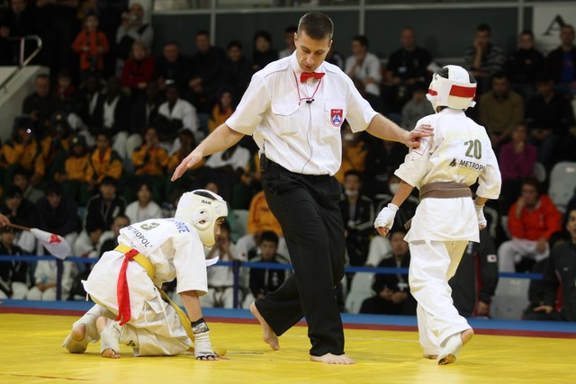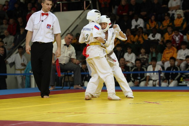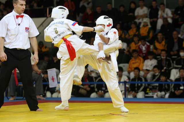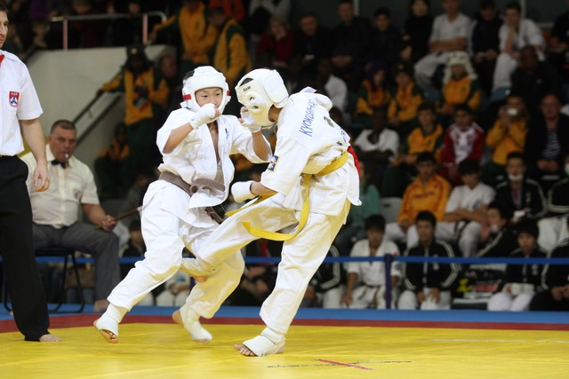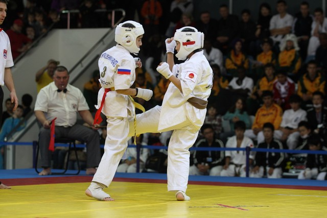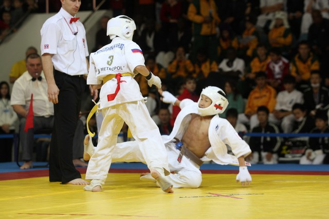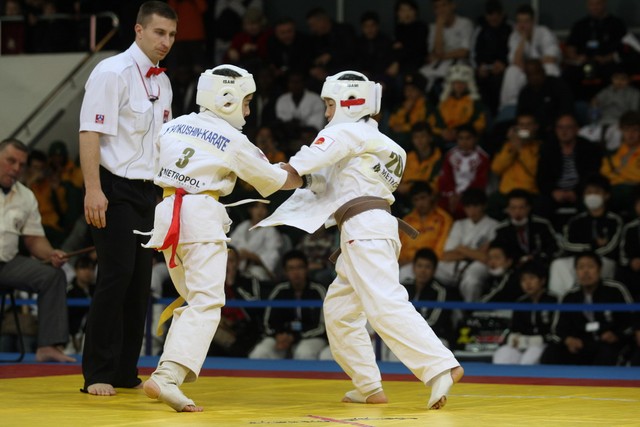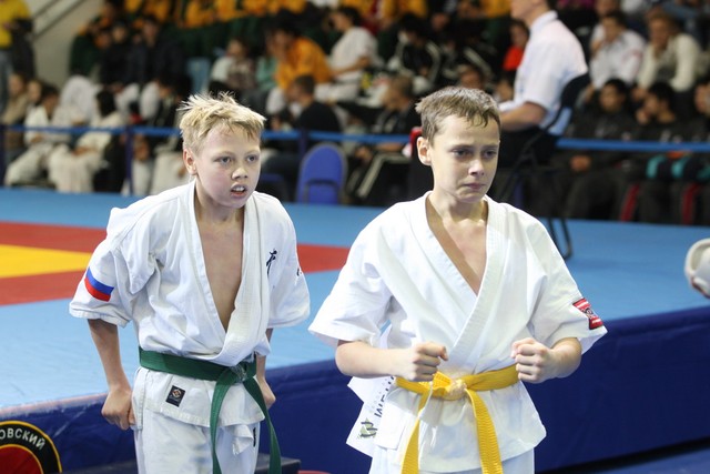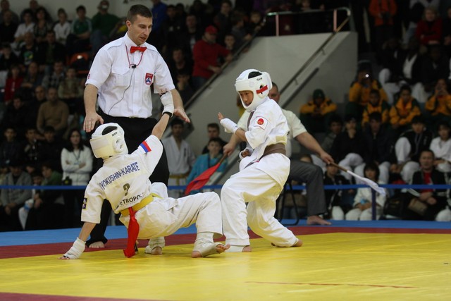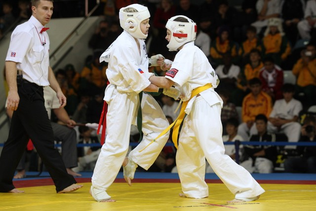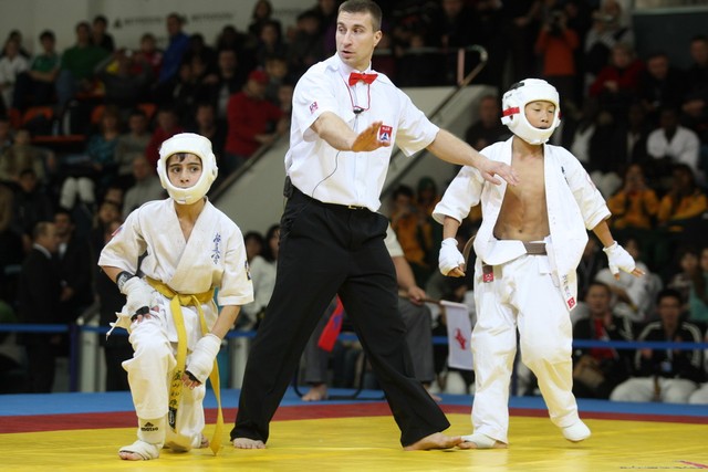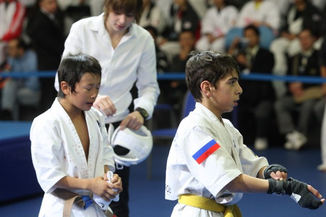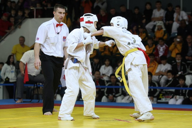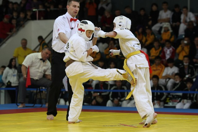 I Открытое первенство мира по Кёкусин-кан. Финальные поединки в категориях «Юноши 12-13 лет, до 35 кг» (Оганесян Ален, Россия, Кёкусин-кан, Волгоград – Садано Коскэ, Япония) и « Юноши 12-13 лет, до 40 кг» (Белышев Даниил, Россия, Кёкусин-кан, Московская область – Васюков Дмитрий, Россия, Кёкусин-кан, Краснодарский край). Фото О. Бессуднова