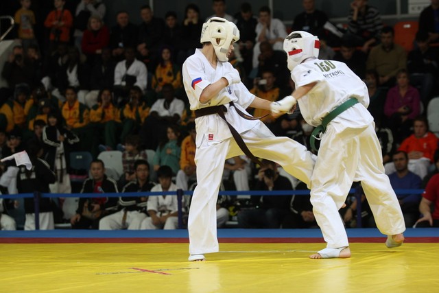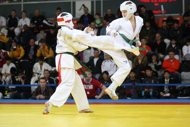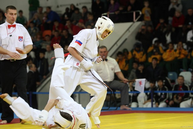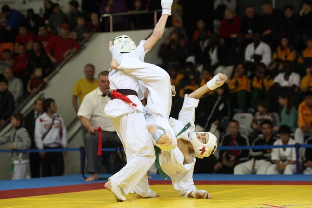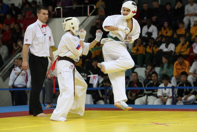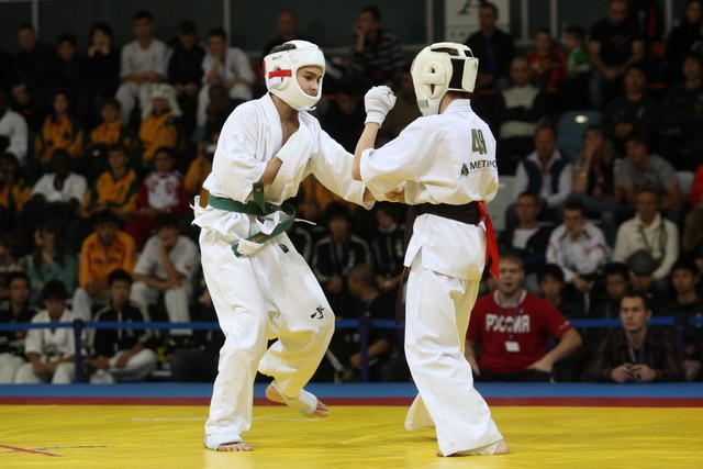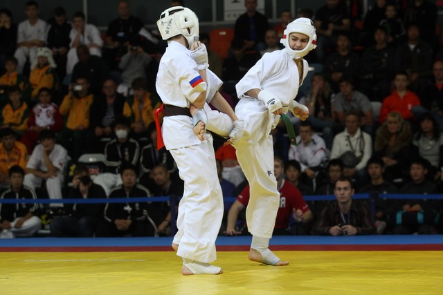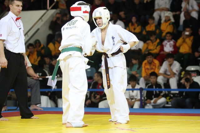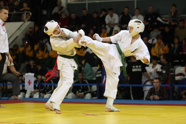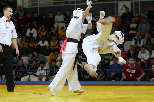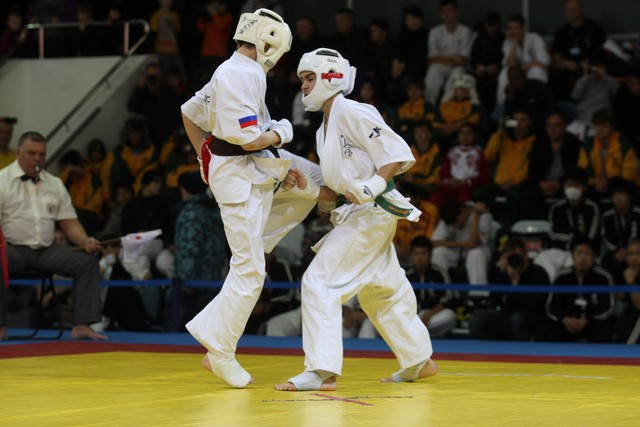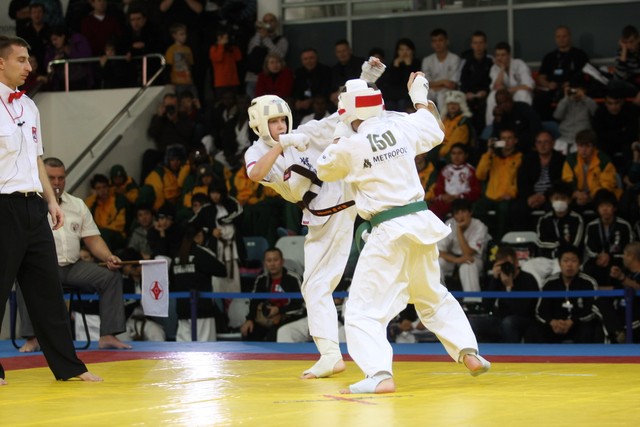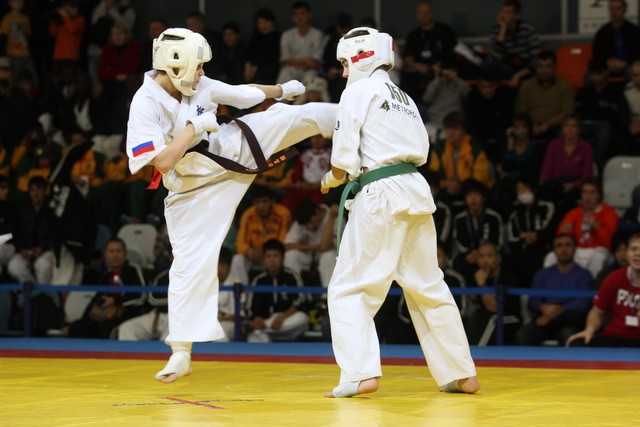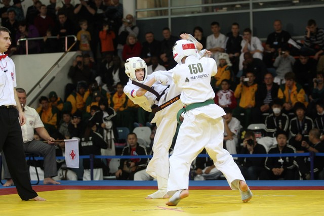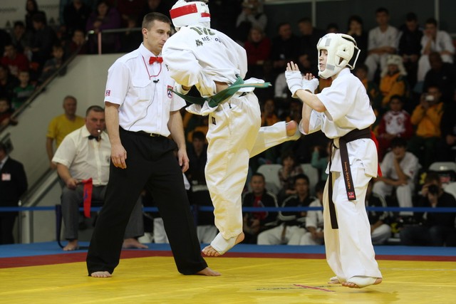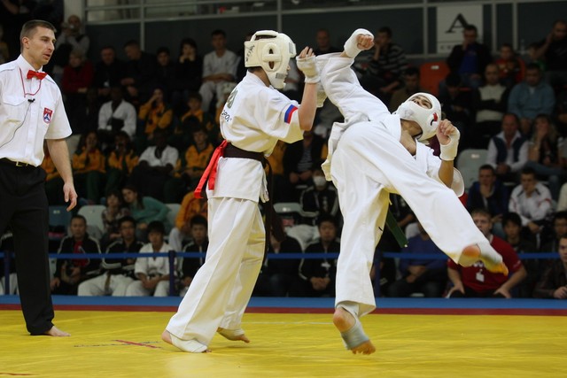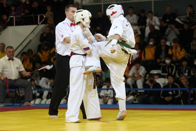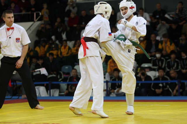 I Открытое первенство мира по Кёкусин-кан. Финальные поединки в категориях «Юноши 12-13 лет, до 45 кг» (Вихтинский Дмитрий, Россия, Кёкусин-кан, Краснодарский край – Ештокин Никита, Россия, Кёкусин-кан, Московская область) и «Юноши 12-13 лет, до 50 кг» (Валиков Андрей, Россия, Кёкусин-кан, Московская область – Зайцев Евгений, Россия, АКР). Фото О. Бессуднова