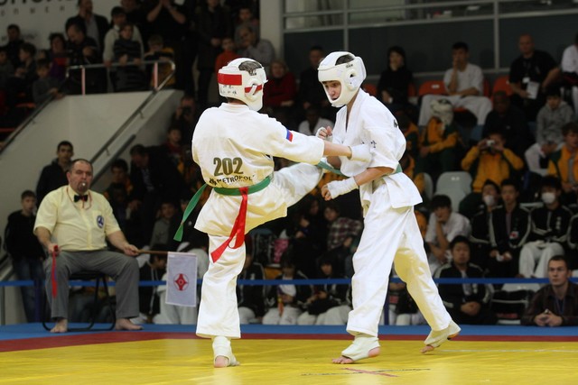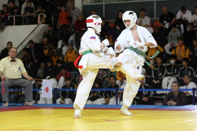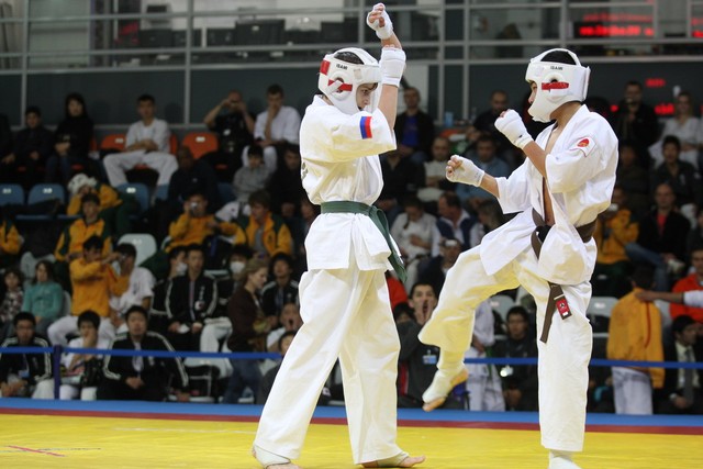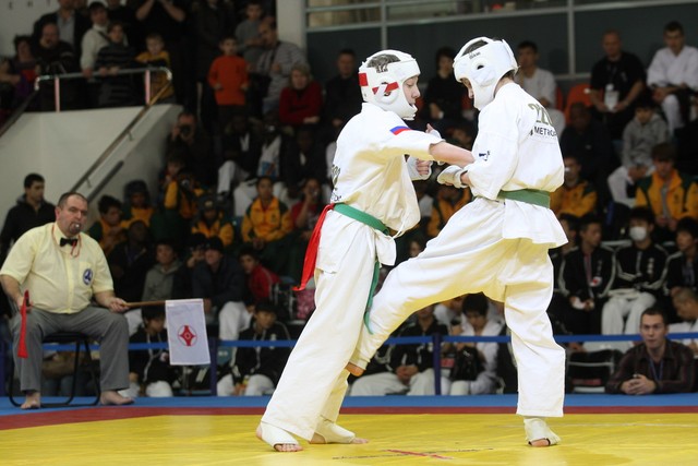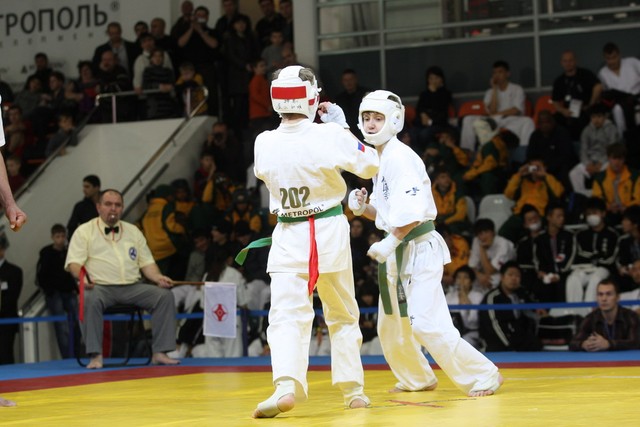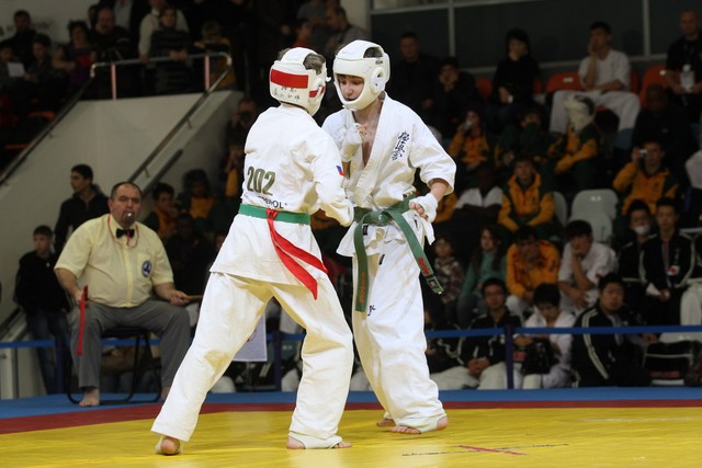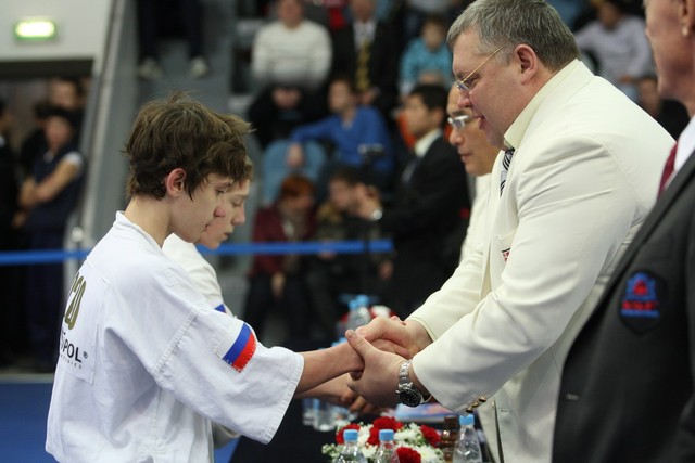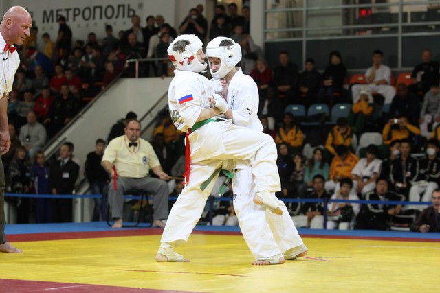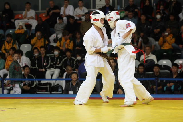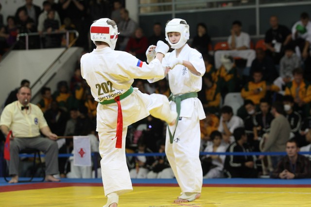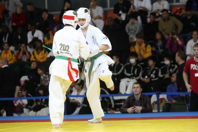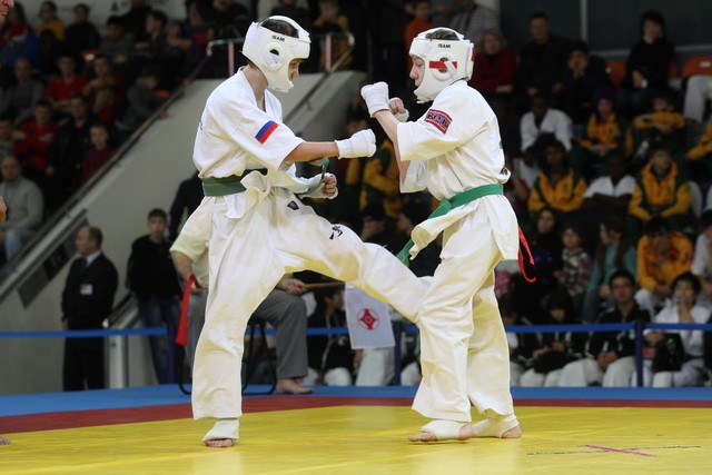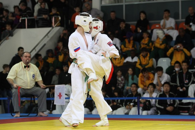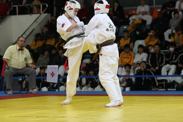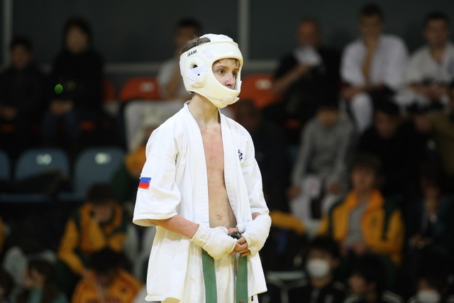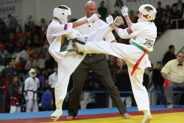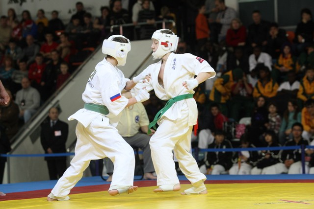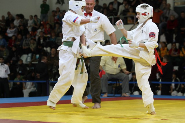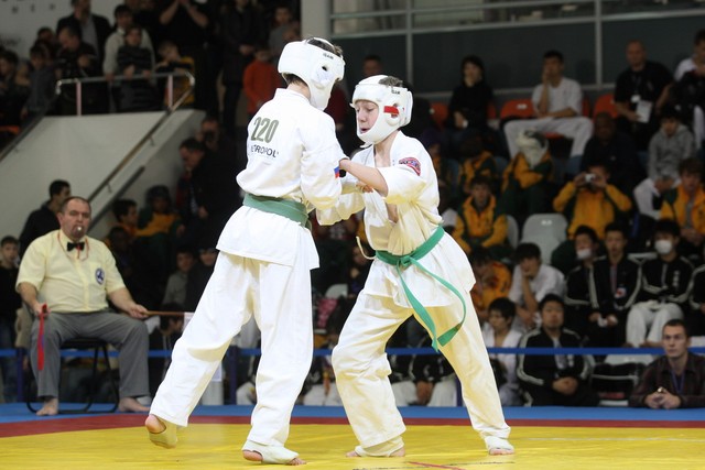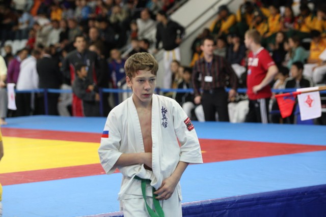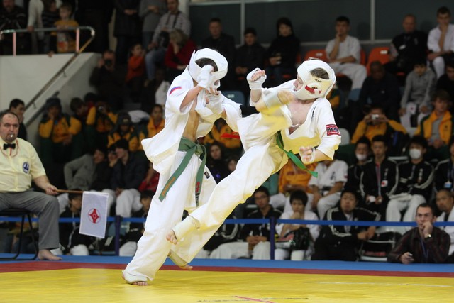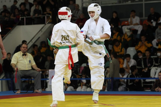 I Открытое первенство мира по Кёкусин-кан. Финальные поединки в категориях «Юноши 14-15 лет, до 45 кг» (Волынко Константин, Россия, Кёкусин-кан, Краснодарский край – Колесников Владислав, Россия, Кёкусин-кан, Московская область) и «Юноши 14-15 лет, до 50 кг» (Нешхлебов Ярослав, Россия, Кёкусин-кан, Краснодарский край – Такидзава Ю, Япония). Фото О. Бессуднова