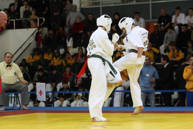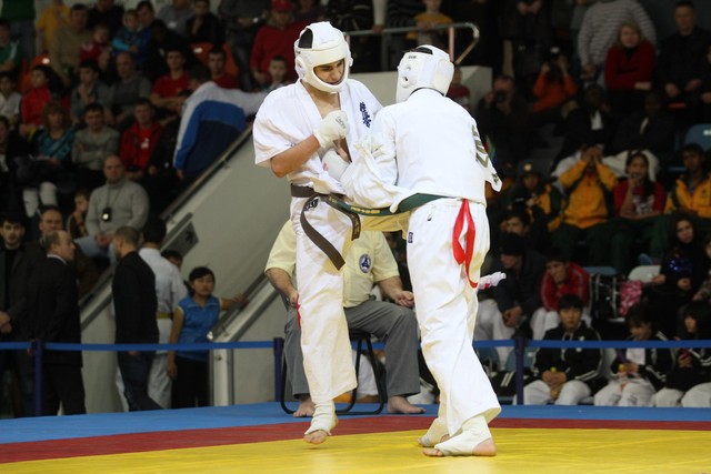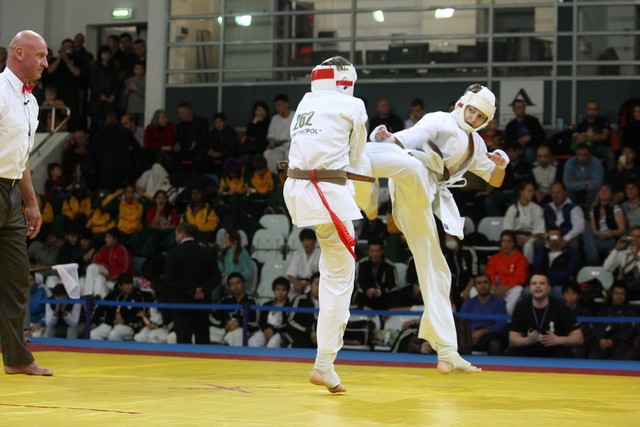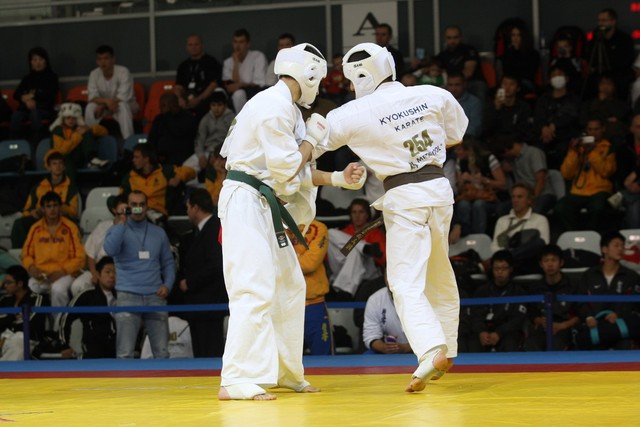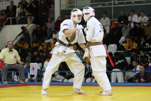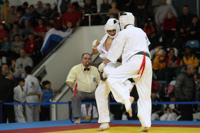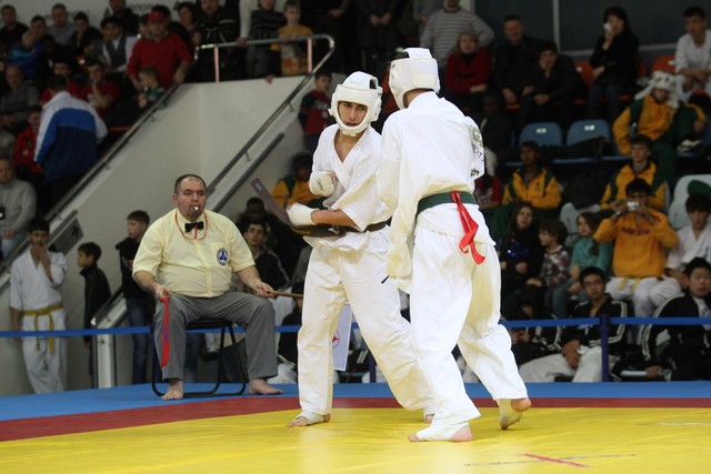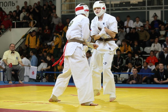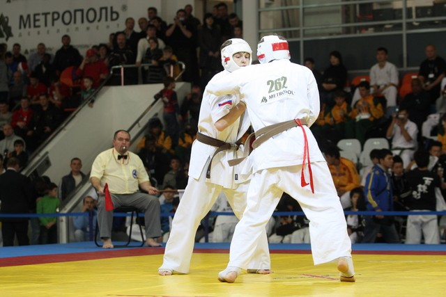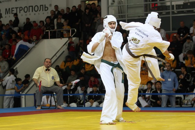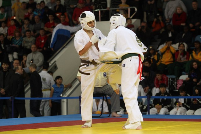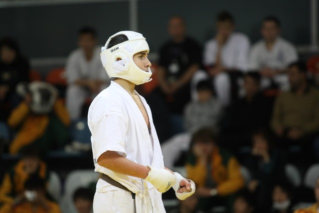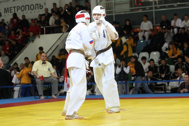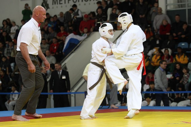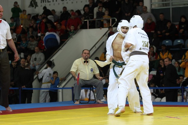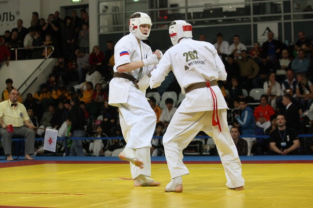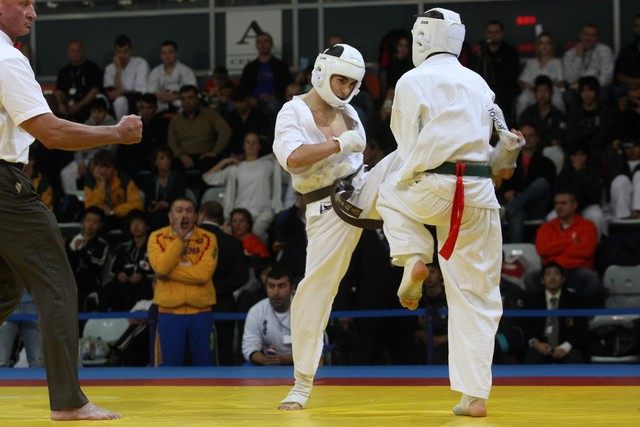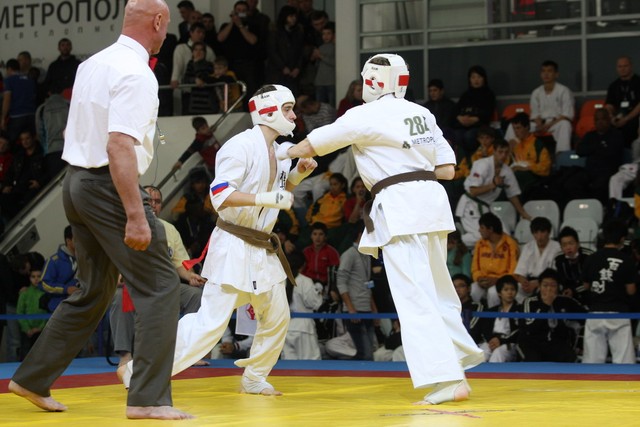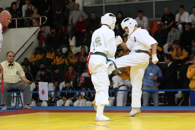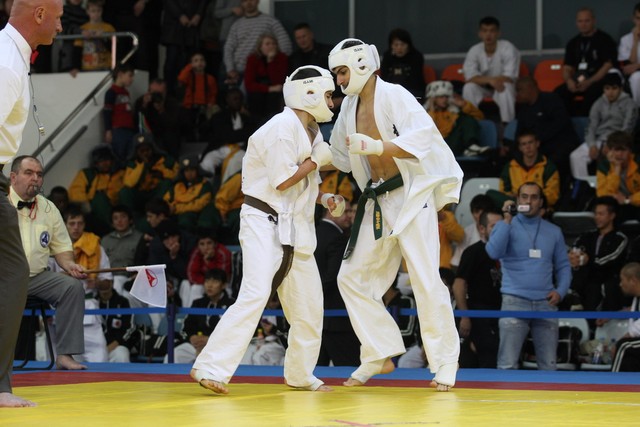 I Открытое первенство мира по Кёкусин-кан. Финальные поединки в категориях «Юноши 14-15 лет, до 55 кг» (Мосоян Жора, Россия, АКР – Абовян Армен, Армения) и «Юноши 14-15 лет, до 60 кг» (Бышин Андрей, Россия, Кёкусин-кан, Московская область – Магомедов Омар, Россия, Кёкусин-кан, Дагестан). Фото О. Бессуднова