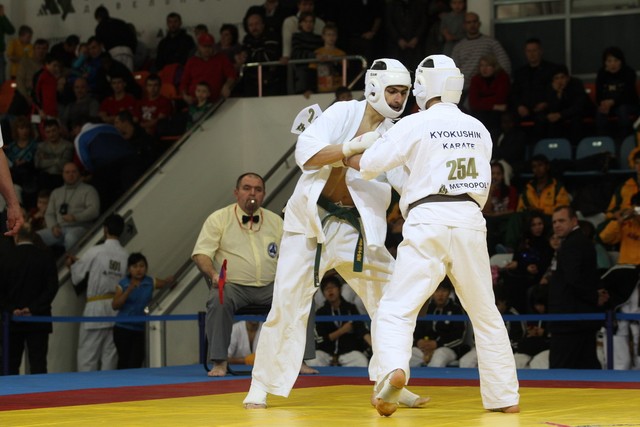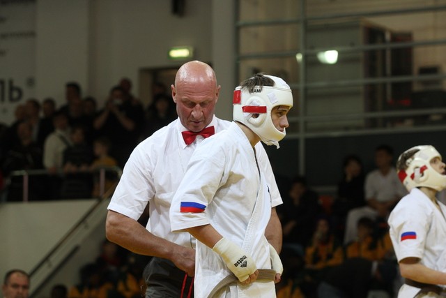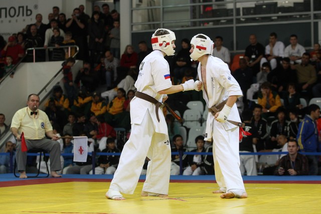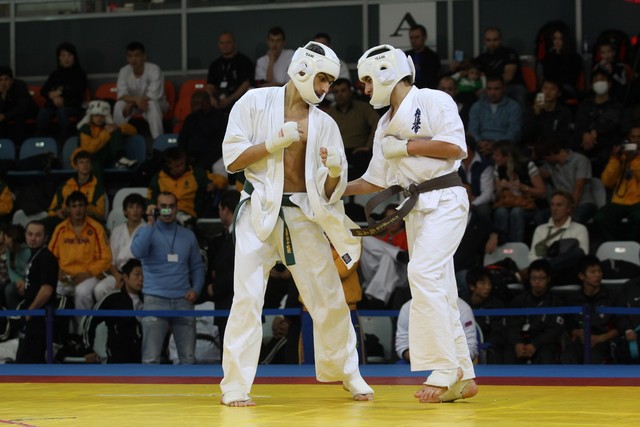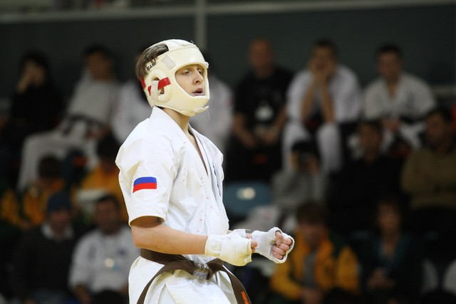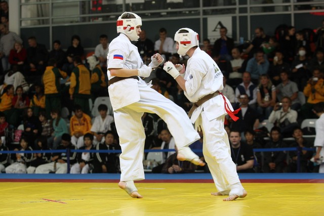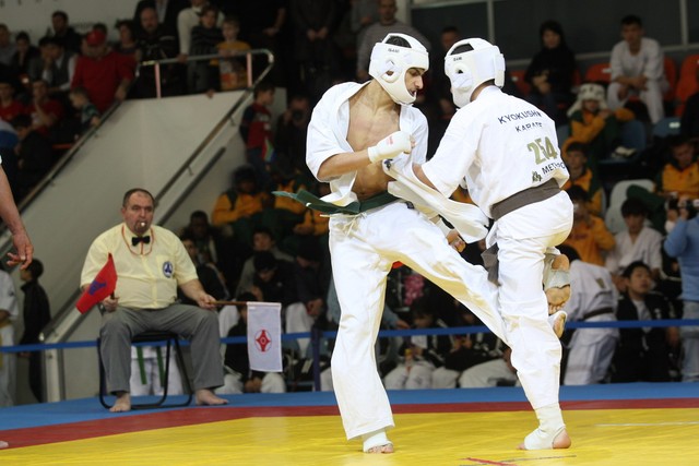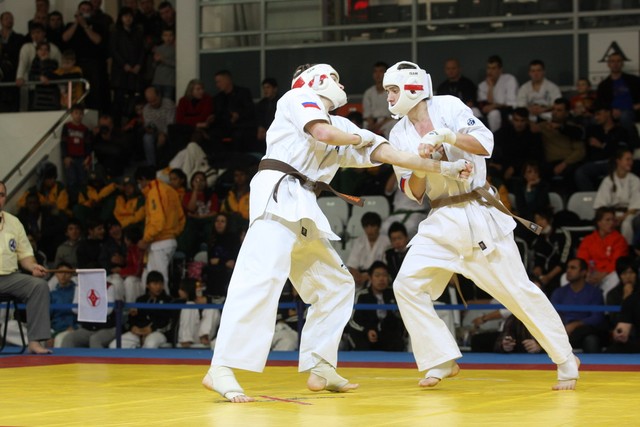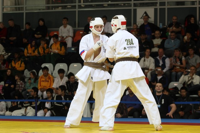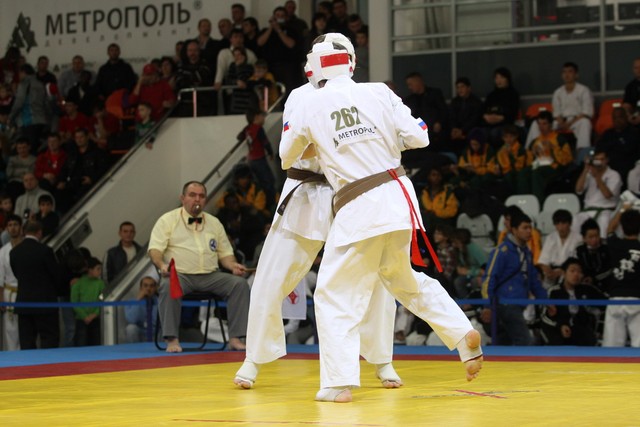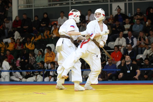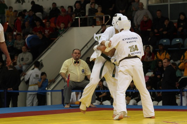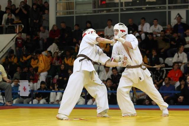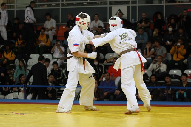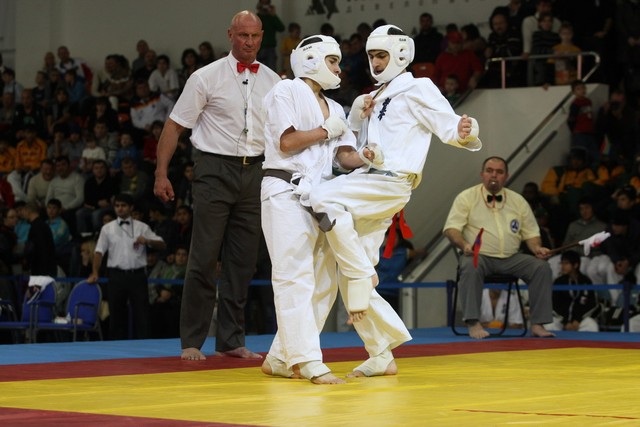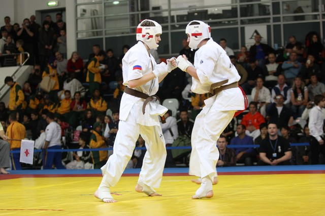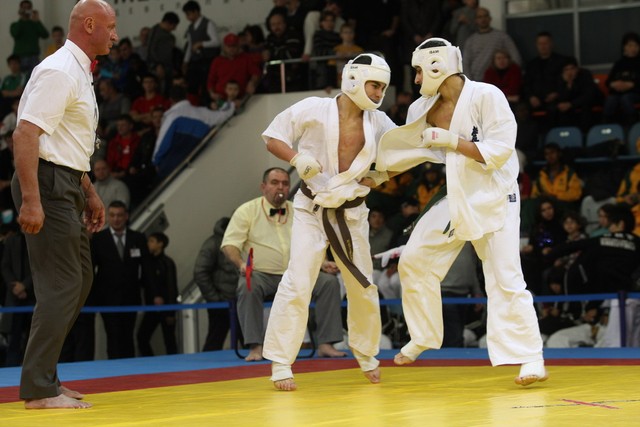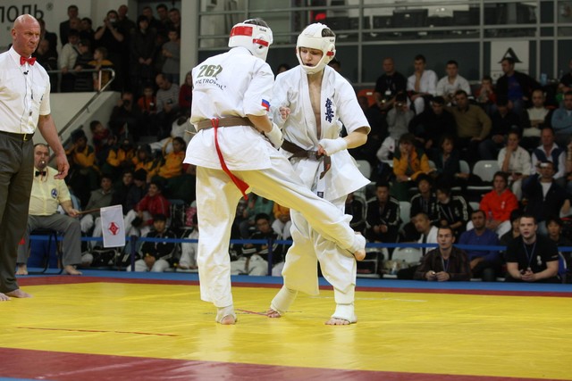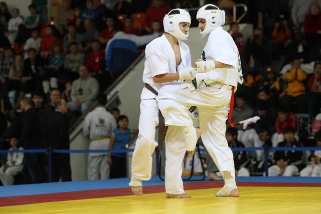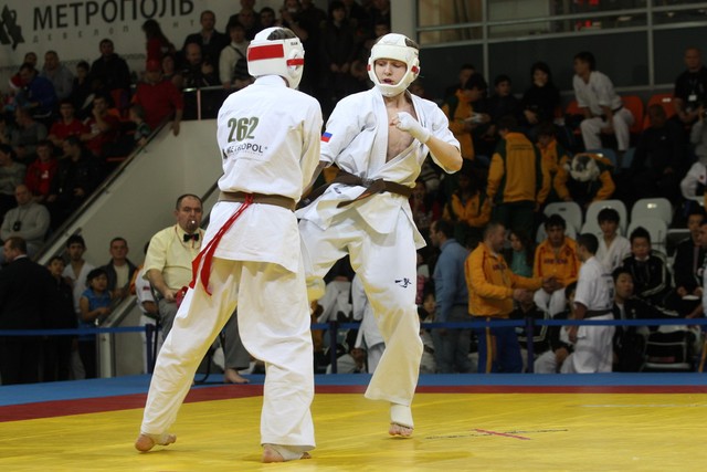 I Открытое первенство мира по Кёкусин-кан. Финальные поединки в категориях «Юноши 14-15 лет, до 55 кг» (Мосоян Жора, Россия, АКР – Абовян Армен, Армения) и «Юноши 14-15 лет, до 60 кг» (Бышин Андрей, Россия, Кёкусин-кан, Московская область – Магомедов Омар, Россия, Кёкусин-кан, Дагестан). Фото О. Бессуднова