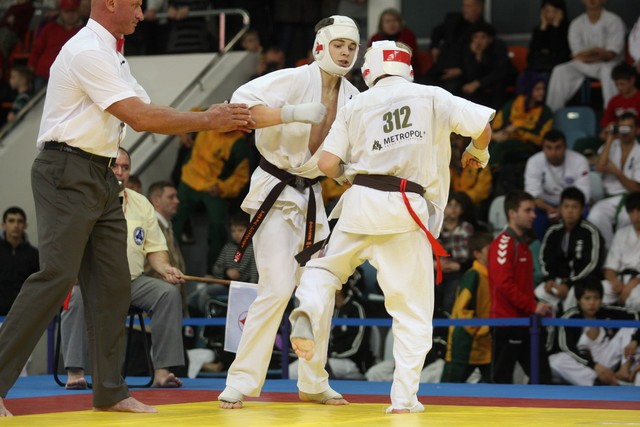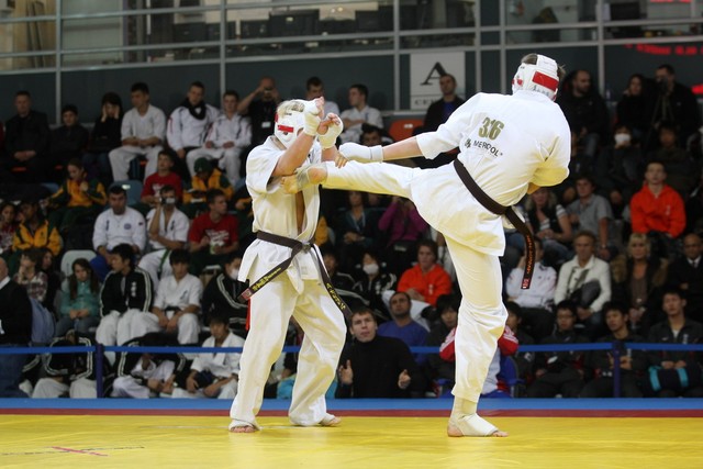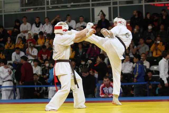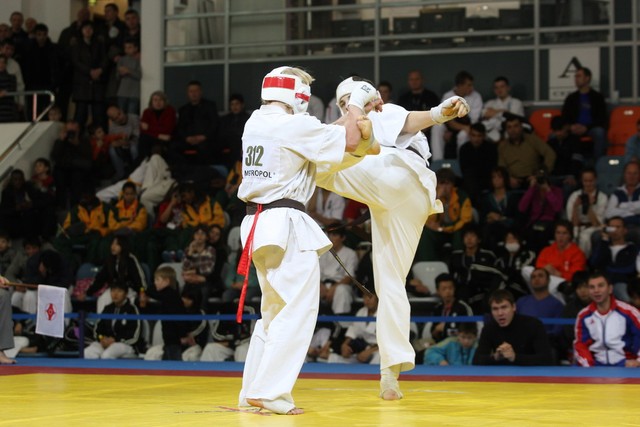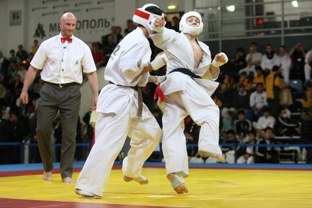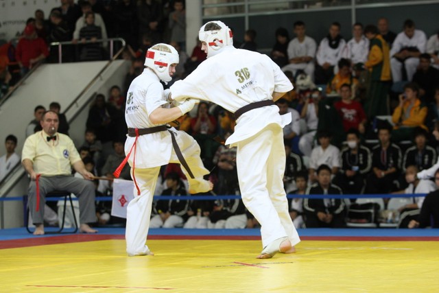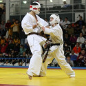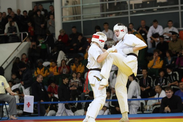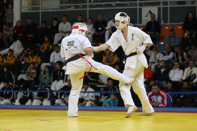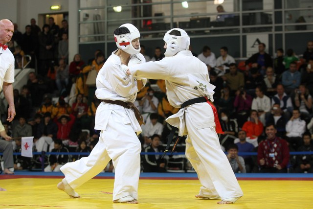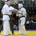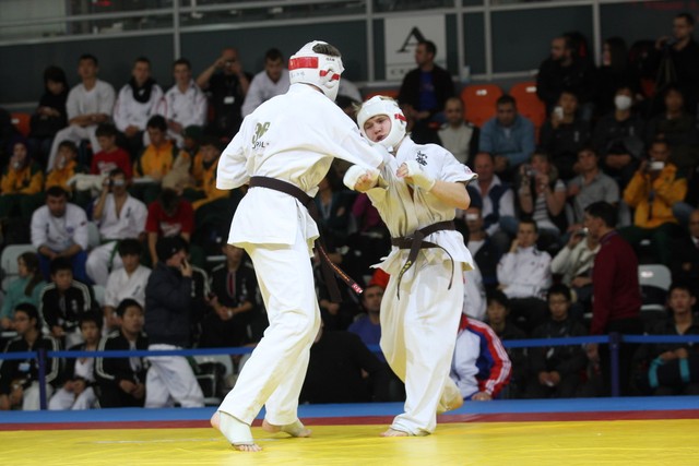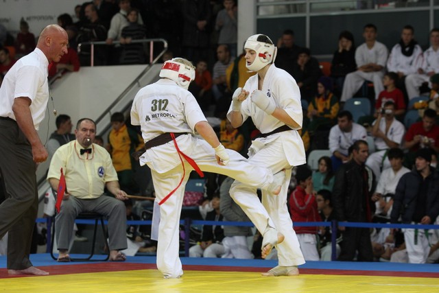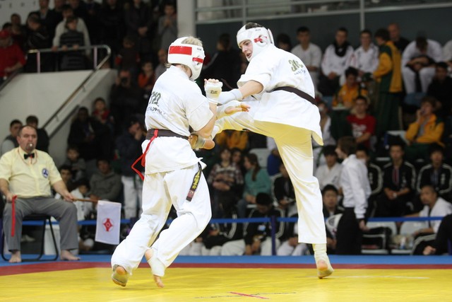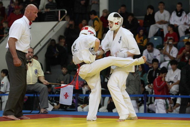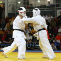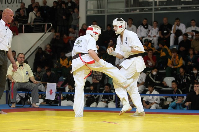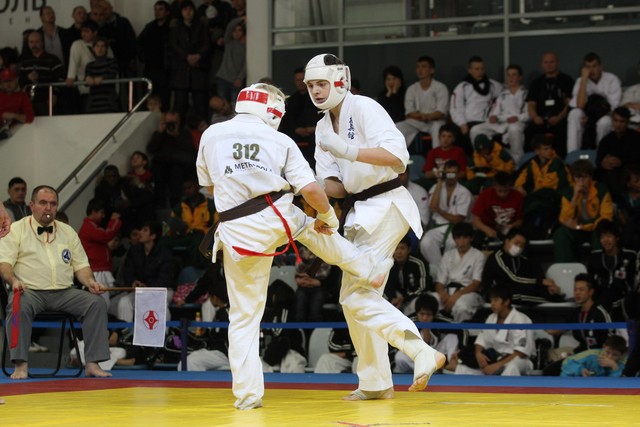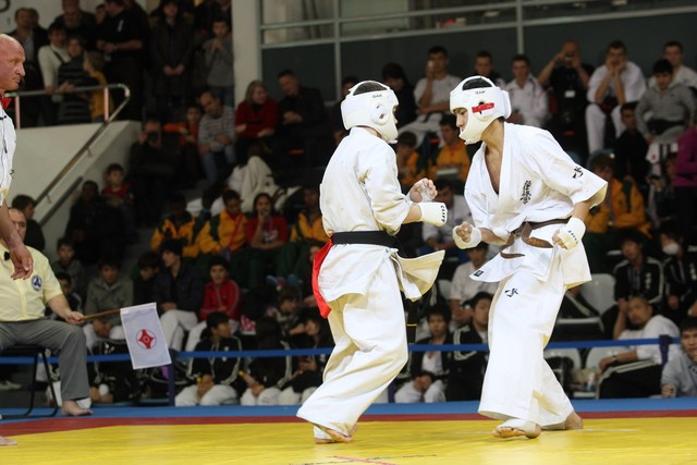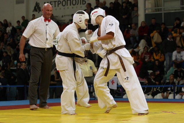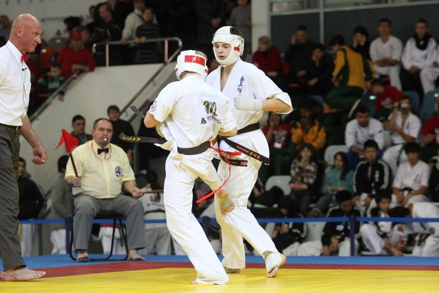 I Открытое первенство мира по Кёкусин-кан. Финальные поединки в категориях «Юноши 14-15 лет, до 65 кг» (Джулдасов Руслан, Казахстан – Звоник Дан, Украина) и «Юноши 14-15 лет, свыше 65 кг» (Спиридонов Андрей, Россия, АКР – Синяговский Артём, Россия, Кёкусин-кан, Краснодарский край). Фото О. Бессуднова
