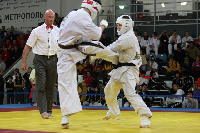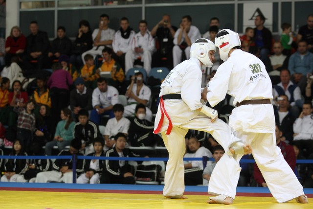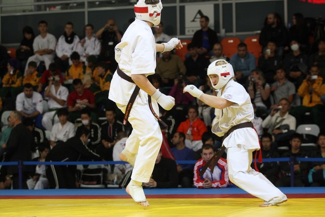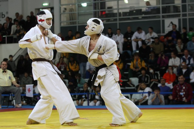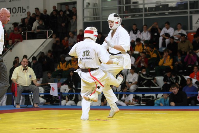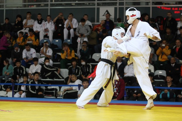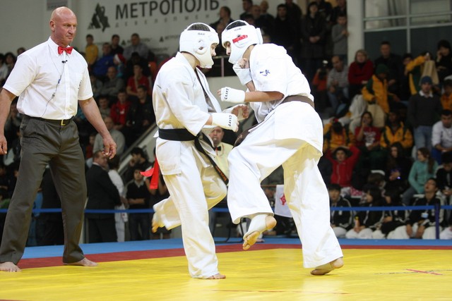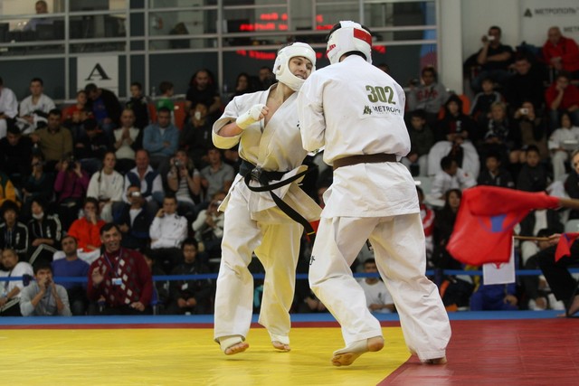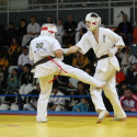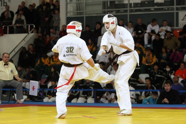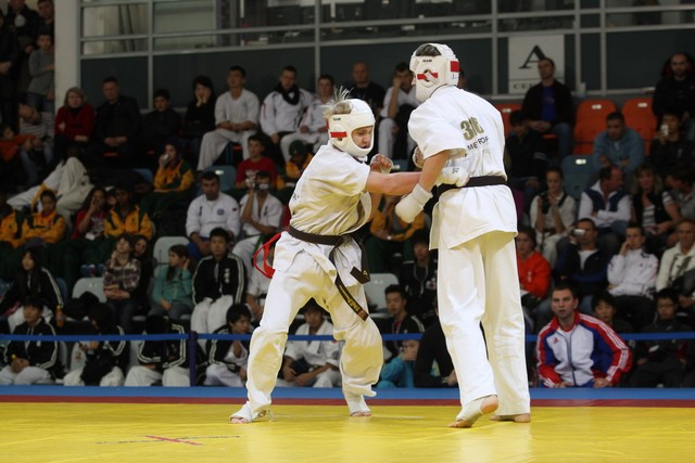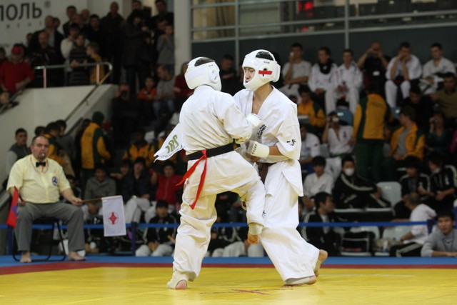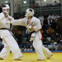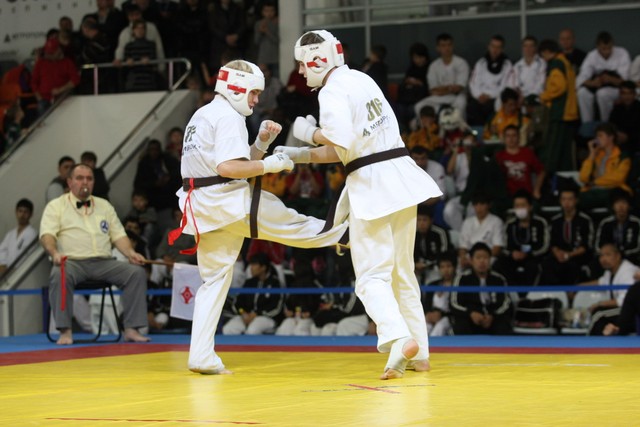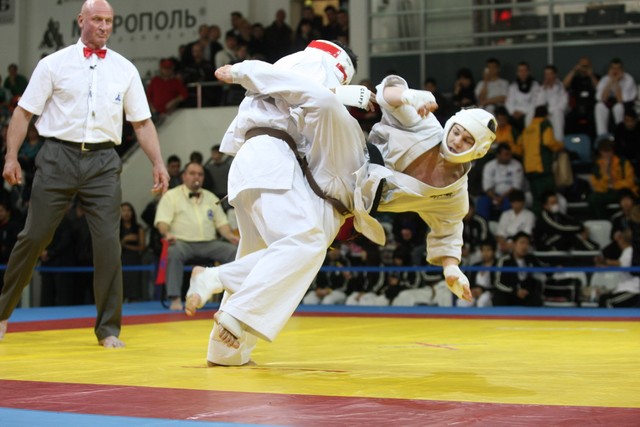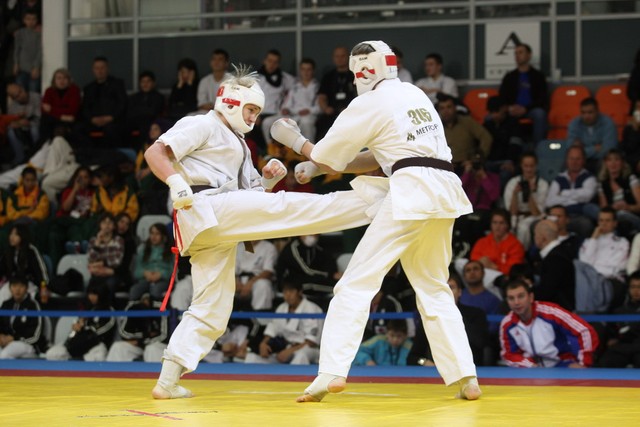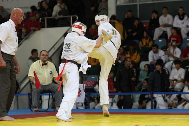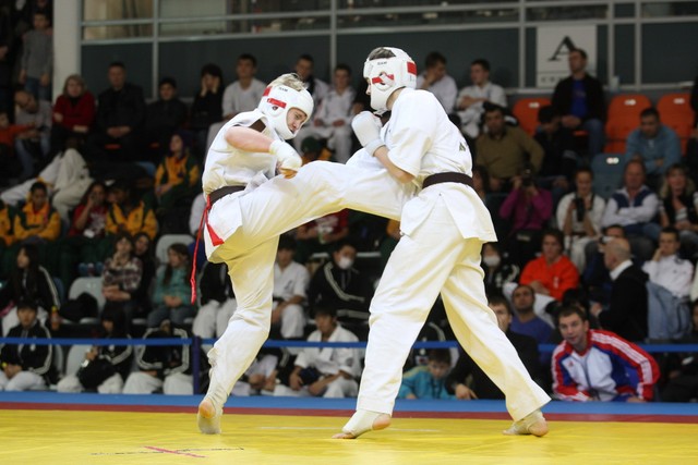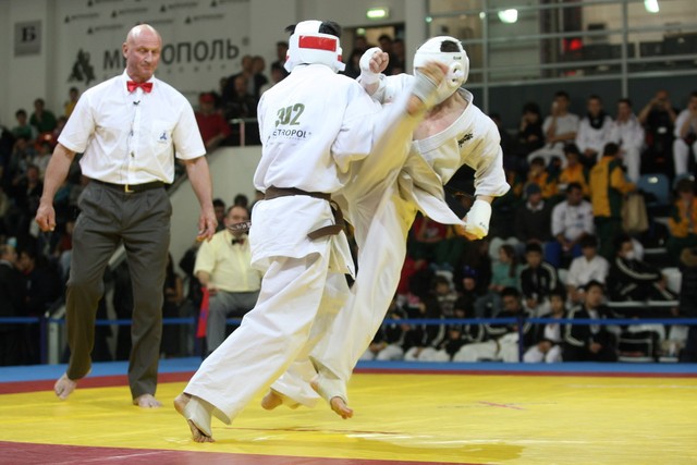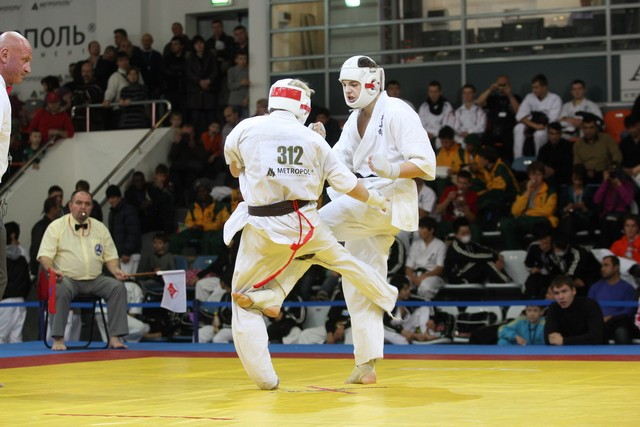 I Открытое первенство мира по Кёкусин-кан. Финальные поединки в категориях «Юноши 14-15 лет, до 65 кг» (Джулдасов Руслан, Казахстан – Звоник Дан, Украина) и «Юноши 14-15 лет, свыше 65 кг» (Спиридонов Андрей, Россия, АКР – Синяговский Артём, Россия, Кёкусин-кан, Краснодарский край). Фото О. Бессуднова