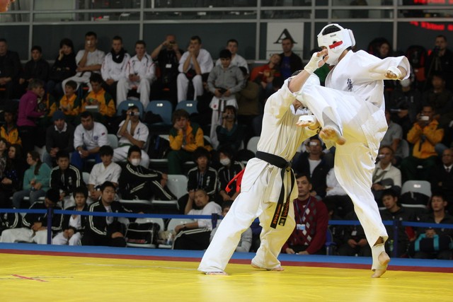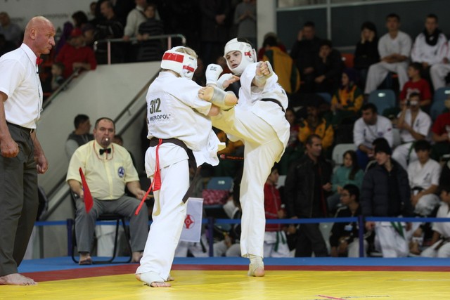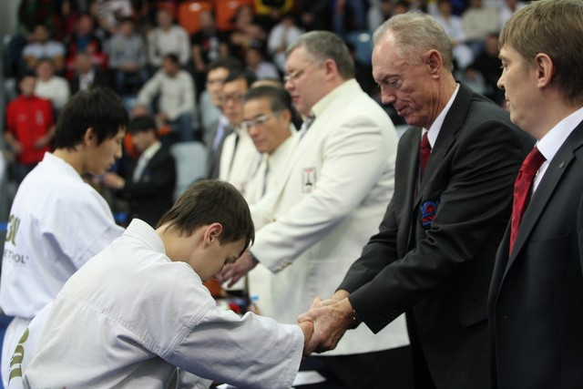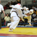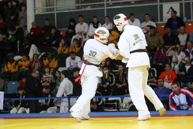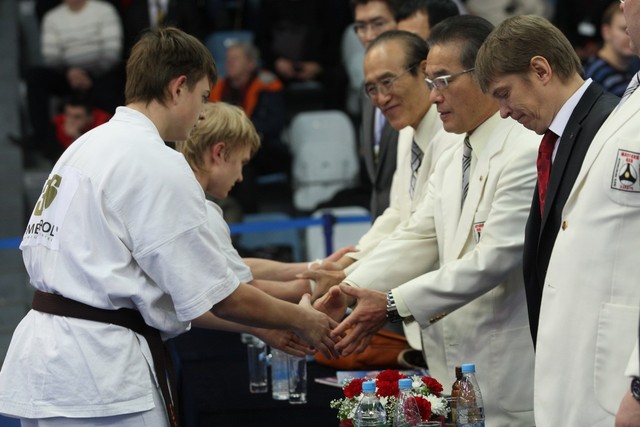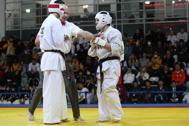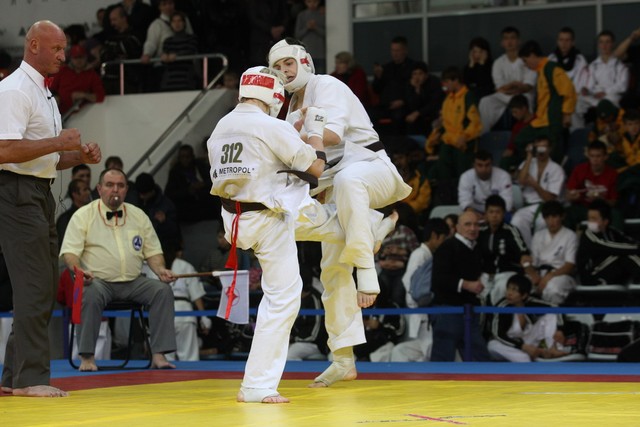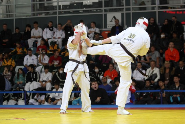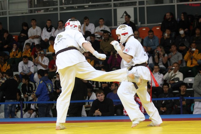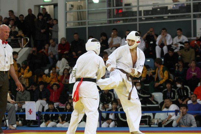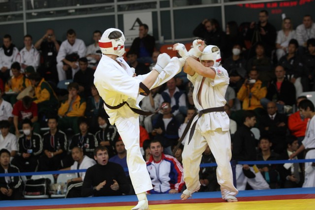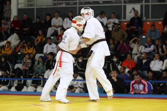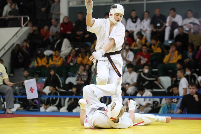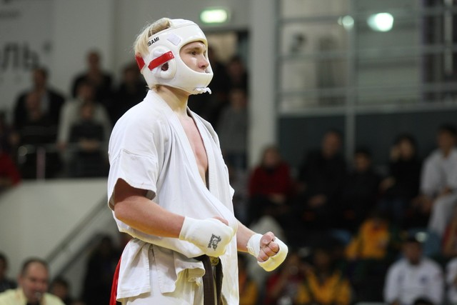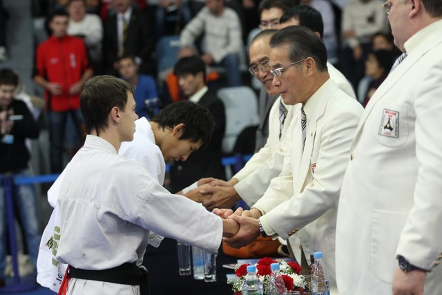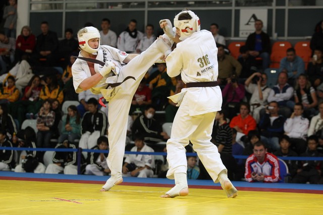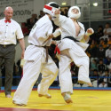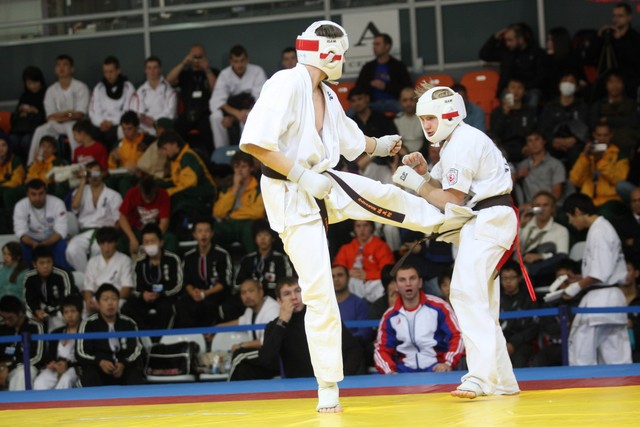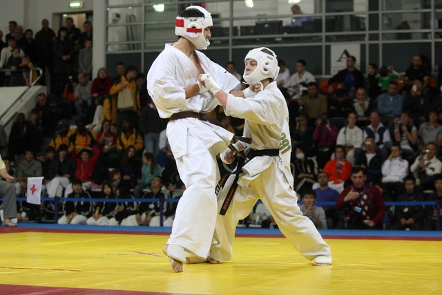 I Открытое первенство мира по Кёкусин-кан. Финальные поединки в категориях «Юноши 14-15 лет, до 65 кг» (Джулдасов Руслан, Казахстан – Звоник Дан, Украина) и «Юноши 14-15 лет, свыше 65 кг» (Спиридонов Андрей, Россия, АКР – Синяговский Артём, Россия, Кёкусин-кан, Краснодарский край). Фото О. Бессуднова