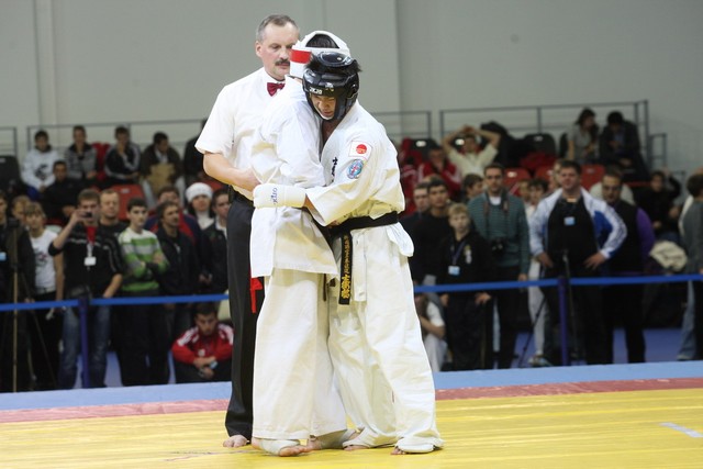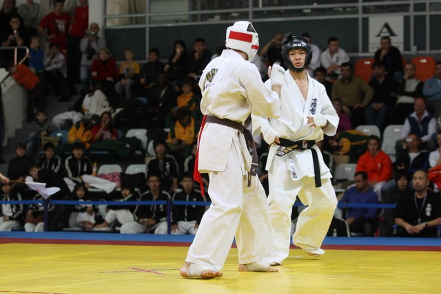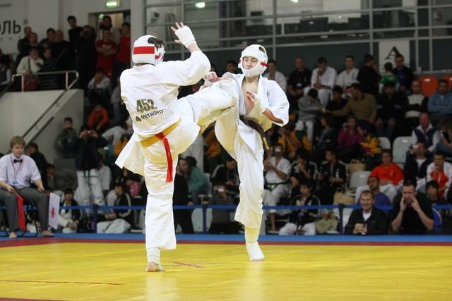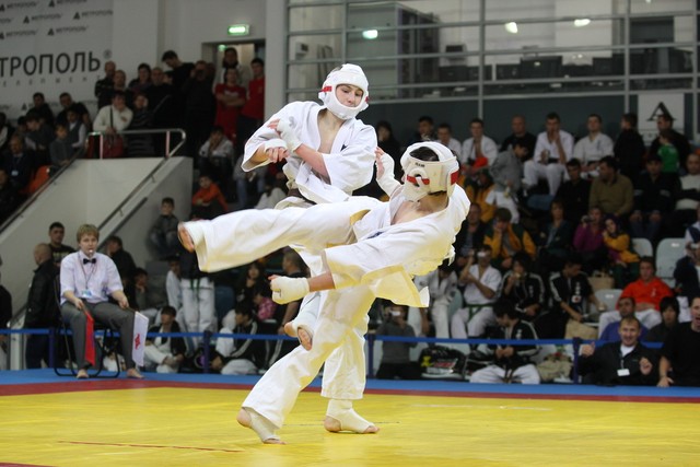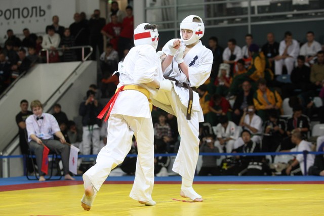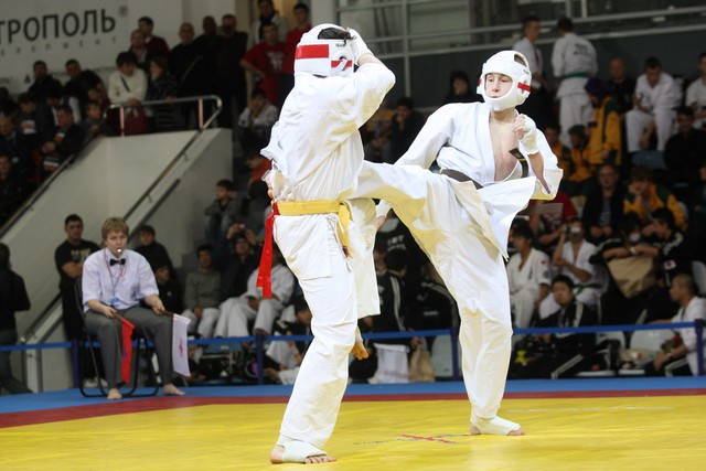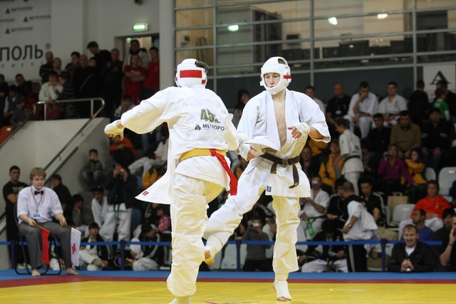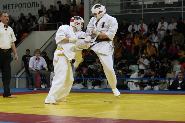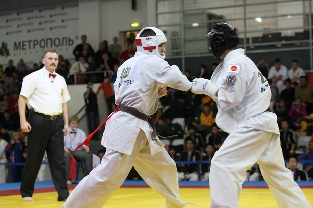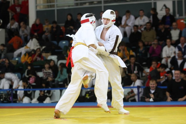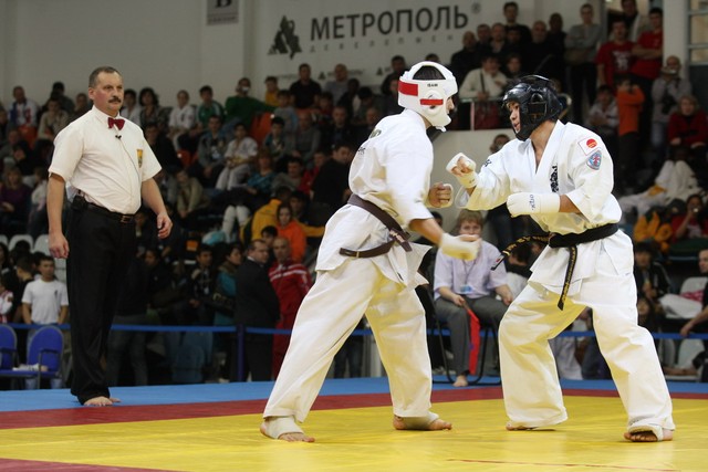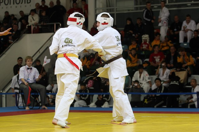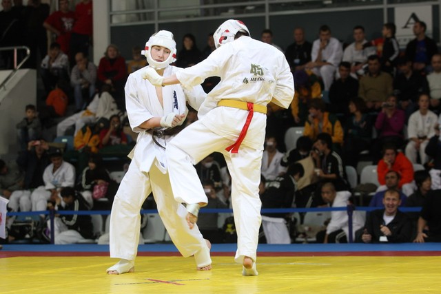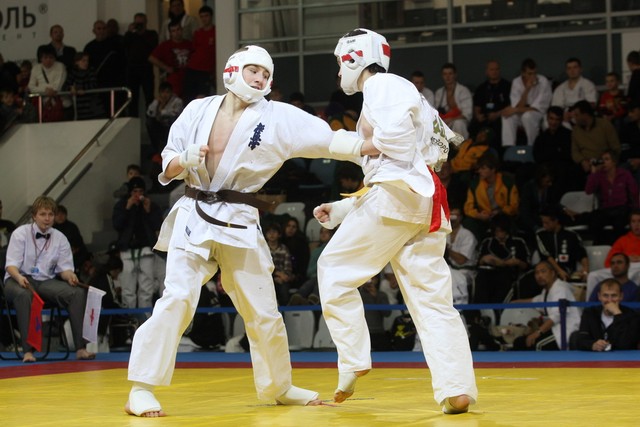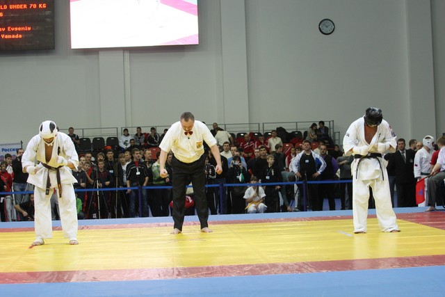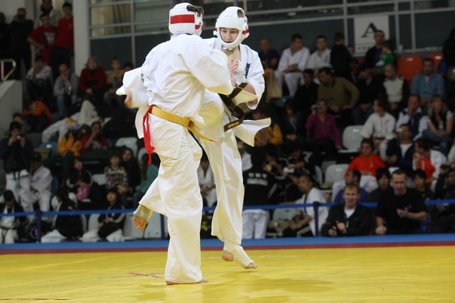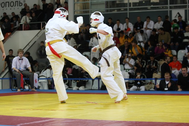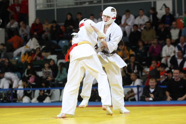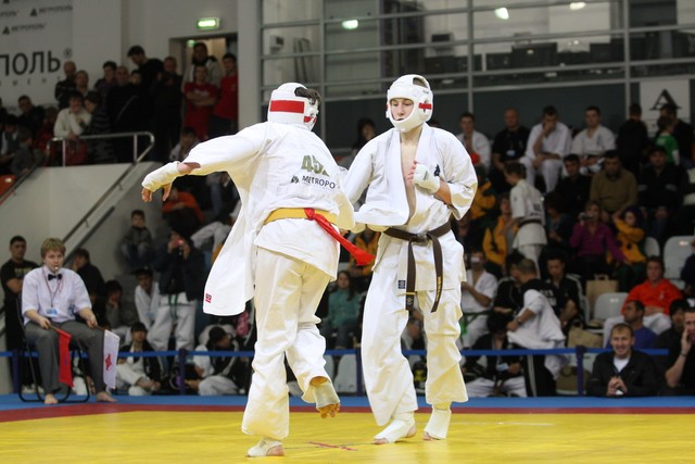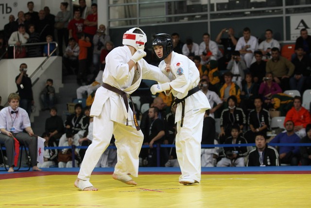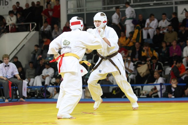 I Открытое первенство мира по Кёкусин-кан. Финальные поединки в категориях «Юниоры 16-17 лет, до 65 кг» (Михалёв Дмитрий, Россия, АКР – Кольченко Никита, Россия, Кёкусин-кан, Краснодарский край) и «Юниоры 16-17 лет, до 70 кг» (Нигамаев Евгений, Россия, АКР – Ямада Рё, Япония). Фото О. Бессуднова